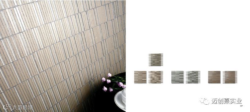 现代和经典美学相结合的代表作品。现代来自于它每根纤细的长条形颗粒元素, 经典在于组成全方向上可连续的装饰图案颇具古典艺术造型之特色. 其中70% 光面和30% 亚光的混合运用,使得整个装饰面富有随机错落的光影变化,运用简