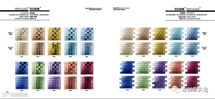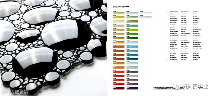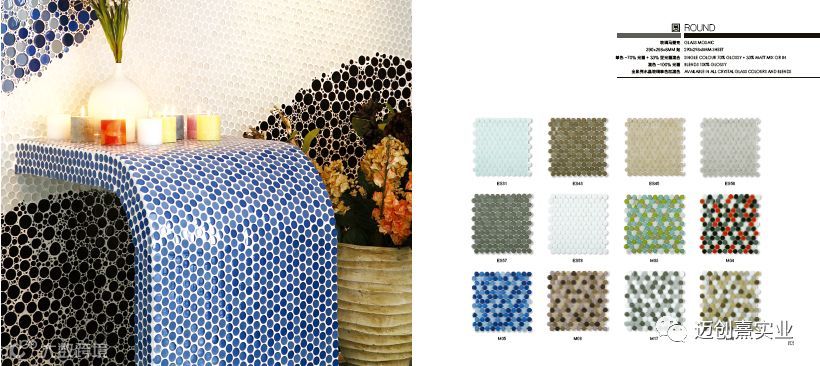 传统的造型,却拥有异常复杂的制造过程。精致的圆(椭)形单片都是通过光学镜片磨片机手工打磨而来- 粒粒皆辛苦。水晶玻璃材质经过二次高温冶烧,使每一颗马赛克平滑圆润、晶莹剔透,69 种单色加上33 种混色组合可供选择,使装饰面极富图案感,除大面积铺贴外,裁成窄条用于带状装饰腰线或垂直的装饰条都是很好的选择方案.