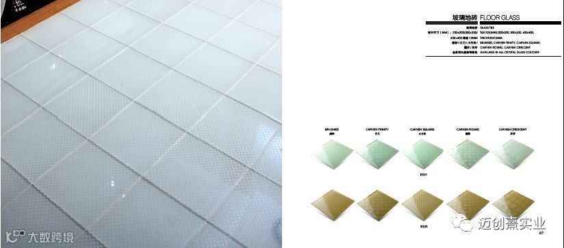 严格上来讲是一款概念型产品, 因为使用玻璃来装饰地面本身是一种超常设计. 主要是因为玻璃一是易碎品, 二是易打滑. 为解决这两个问题, 第一我们玻璃地砖的厚度为12MM 而且经过了800 度高温退火, 硬度和韧性都达到了比普通釉面砖都好的水平,这解决了易碎的担忧. 二是我们对表面进行了毛面处理, 第一款是表面淋沙处理, 第二款是在表面重新烧结了一层玻璃粉, 使得表面柔和但微观颗粒又有很好的防滑性能. 还有四款是用玻璃粉烧制的各种凸起的图案, 既有美观效果又有防滑功能, 因为这些图案是玻璃粉末通过丝网印刷并800 度烧成在玻璃表层的, 所以耐久性, 抗磨性都与整体玻璃一致. 所有的六个表面都在澳洲,美国和意大利做了防滑测试, 全部达到欧美国家室内地面安全使用标准. 并且抗污性能非常好, 几乎所有的落污都可以用普通家用清洁剂立即清除. 这款产品主要是给一些特别雅致或私人空间的地面特意打造, 这些场所必须是人流量小, 没有尖锐物件踏踩.可以推荐在高档私家卫浴间, 主卧室, 日韩餐厅包间等任何软接触地面都可使用. 这个产品的使用环境有比较严格的选择. 要避免硬物或尖锐物的磨伤。此外产品可以用于地热系统. 产品有6个不同的表面或图案可以选择, 每款都是形色各异。