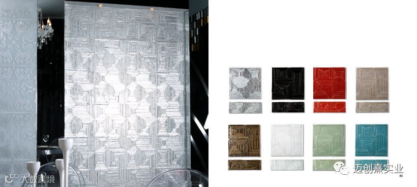 约和现代的设计元素, 使华丽含蓄的隐藏在纤纤细节与柔光掠影之间。与此同时,产品的排列又融合中国传统图案上的“回纹”处理手段, 使得产品在现代装饰运用之间,不经意地体现出中国文化的装饰特色。产品也有300X100 腰线可供选择。