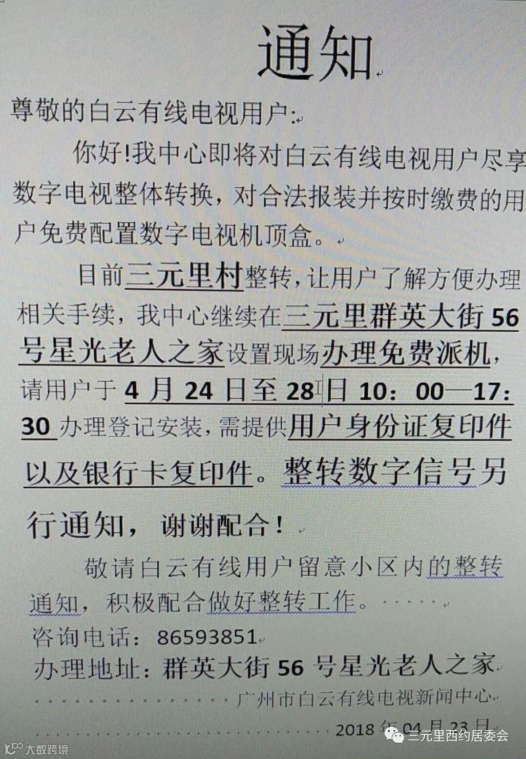 接白云有线电视通知,自2018年4月12日起,将对三元里村进行数字电视的整体转换,同时取消