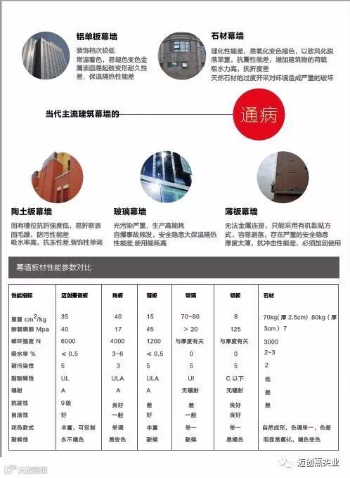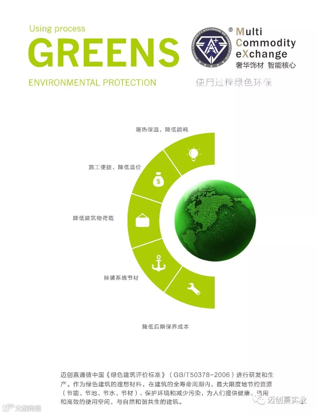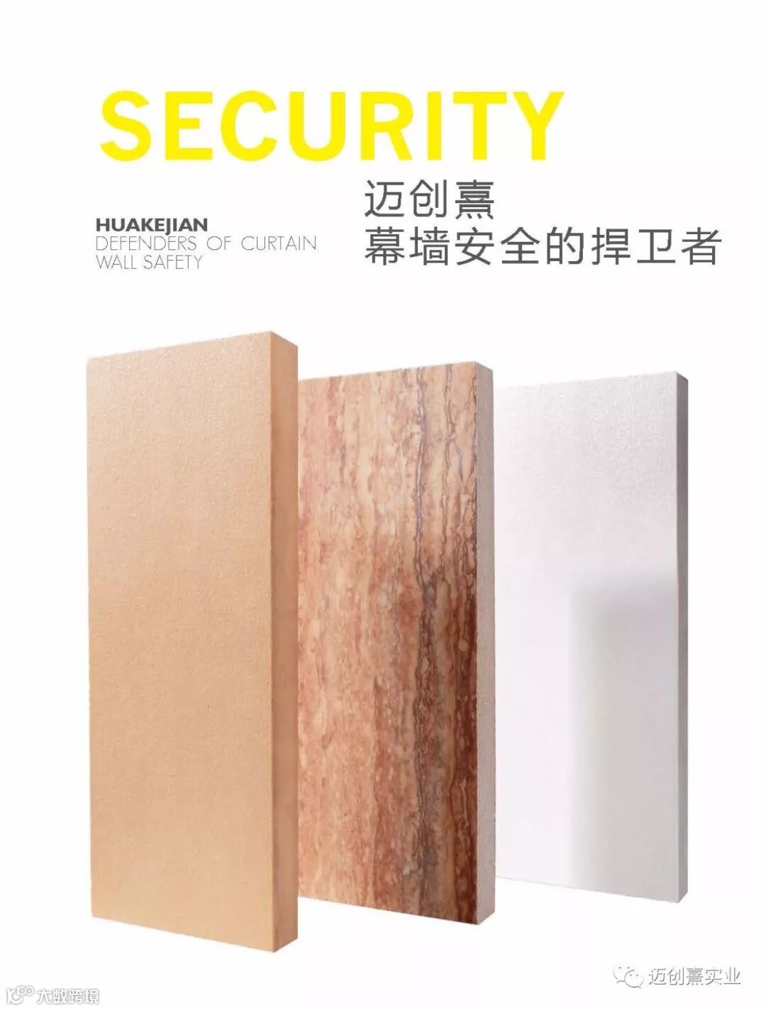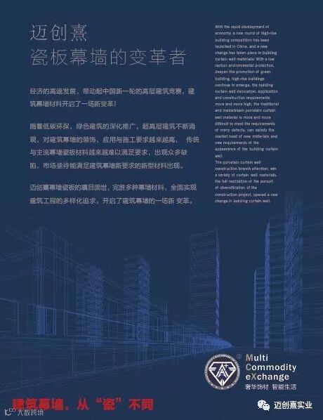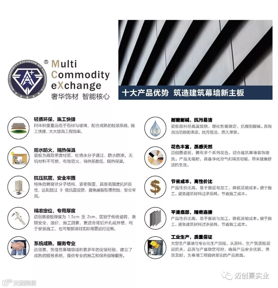 迈创熹新型瓷板幕墙,融美观性、环保性、安全性、经济性、功能性于一体,是现代建筑幕墙的理想材料,其 “三性(气密性、水密性、抗风压)”及耐酸碱、耐候性、抗冲击强度、内照射、外照射等各项关键指标,均达到或优于建筑幕墙标准(GB/T 21086—2007)。精准的市场定位、差异化的竞争策略、基于科学测算并区别于传统瓷砖的 1.5CM 至 2.0CM 区间的多元化厚度、成熟而领先的高精度 3D 喷墨打印技术应用、基于力学与仿生学前沿理论研发的的 HKJ 挂装系统——迈创熹专业团队服务前置、系统突围,从款式、花色、面状的定向开发到一板多面功能集成,全流程介入,深度增值服务,为现代高端建筑量身订制时尚雅致、韵味独特、颜值更高、独一无二的“多功能陶瓷外衣”,为建筑设计师灵感的实现,提供了无限的可能。