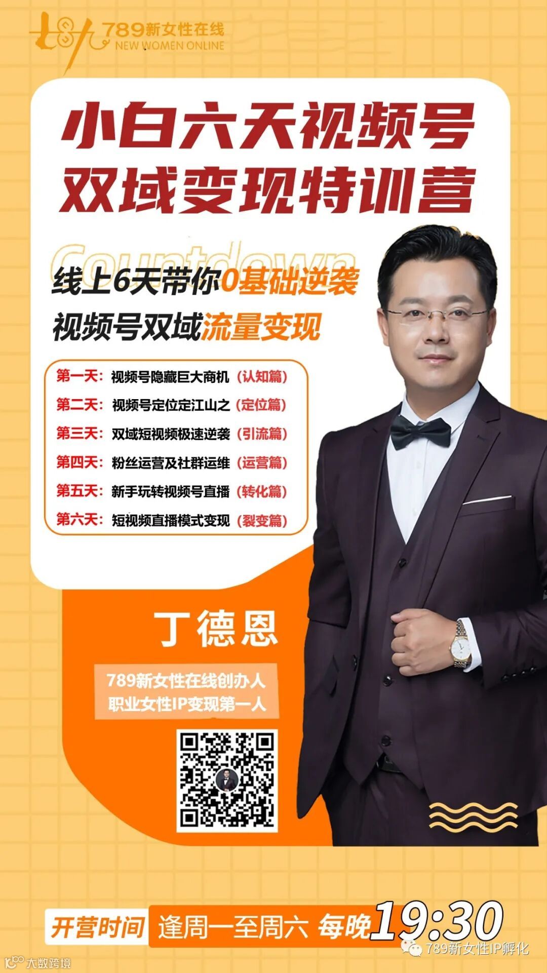 对了,如果你是小白,或刚刚在做短视频或直播,或做了一段时间没什么效果或没有信心,那么我强烈推荐大家去我的公众号,有一节《小白六天视频号双域变现特训营》