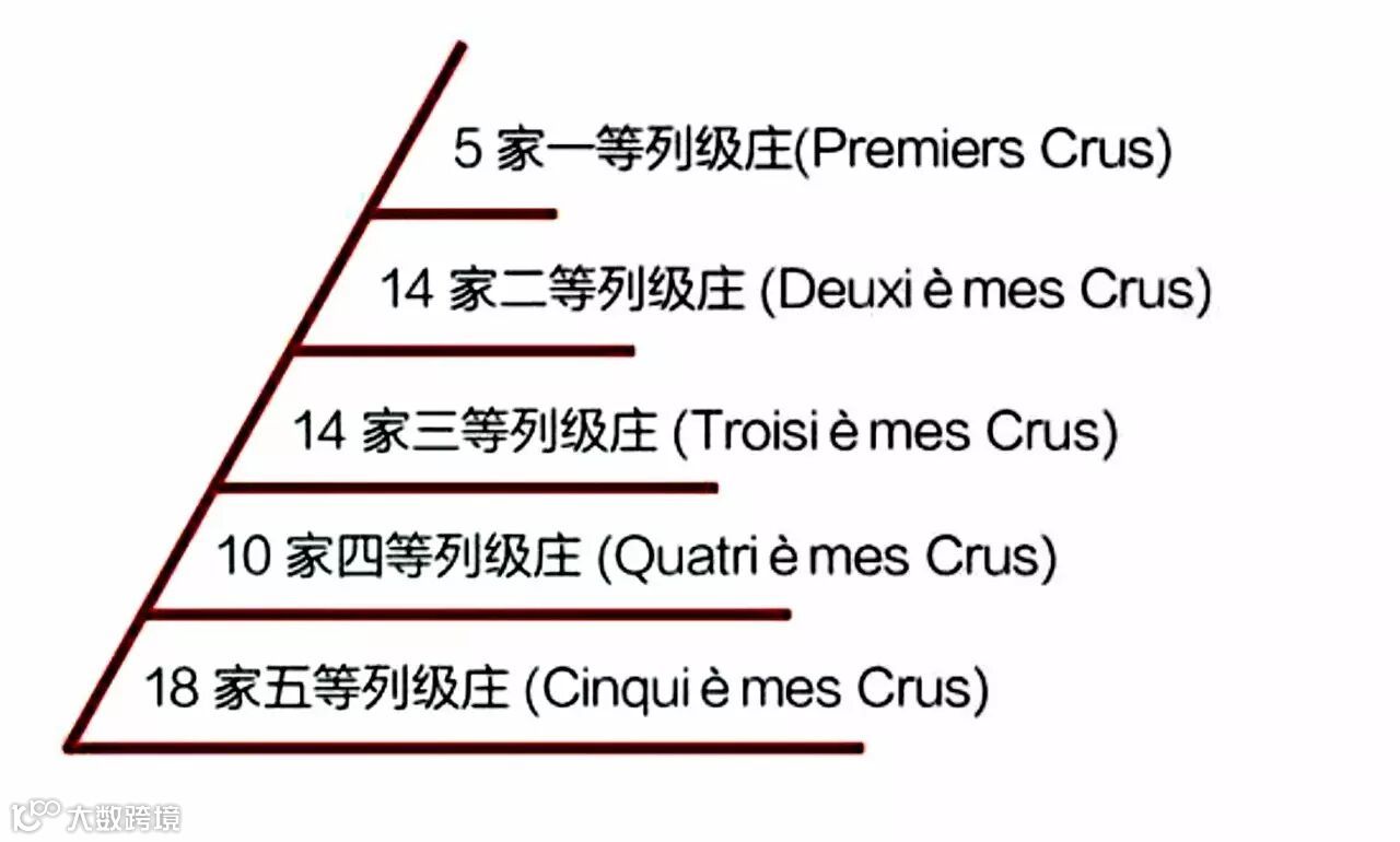 梅多克和索泰尔讷 在拿破仑三世倡导下,一套波尔多葡萄酒庄分级制度于1855年应运而生,它列出61家酒庄:60家梅多克酒庄(Médoc châteaux)与1家佩萨克-雷奥良的酒庄(Pessac-Léognan)。该制度共划分五个级别: