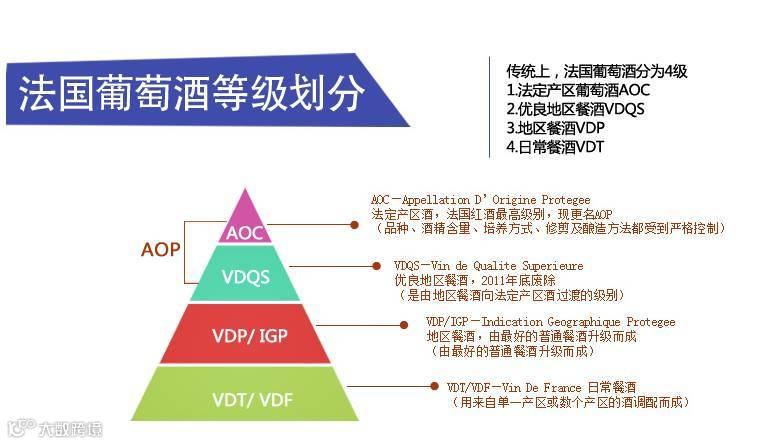 法国对本国葡萄酒有着严格法律保护,实行原产地控制命名制度,即AOC制度。这个保护制度将葡萄酒划分为日常餐酒(VDT,占11.7%)、地区餐酒(VDP,占33.9%)、优良地区餐酒(VDQS,占0.9%)和法定产区葡萄酒(AOC,占53.4%)。这个制度不仅对于法国,甚至对于整个世界都有深远影响。