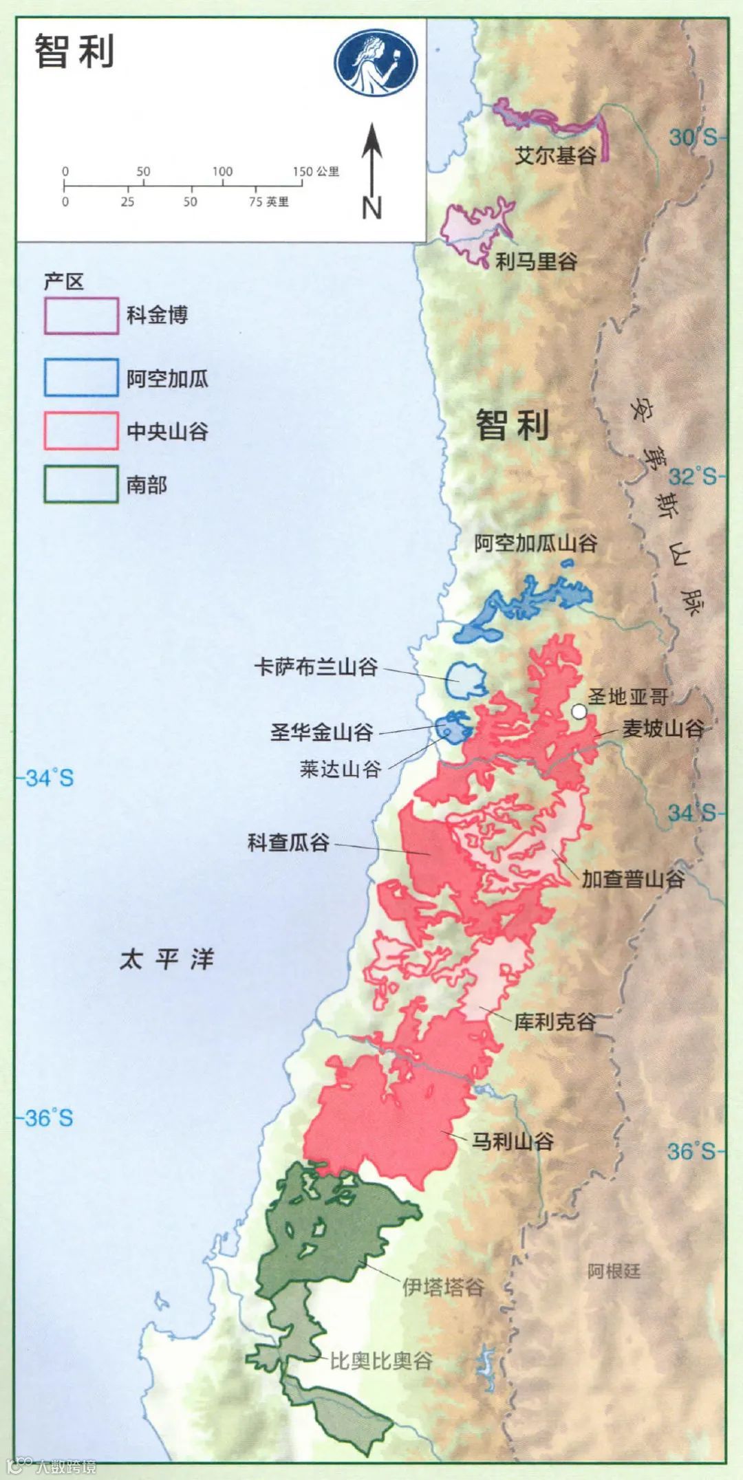 智利有四个主要产区,由北到南依次是:科金博(Coquimbo)、阿空加瓜(Aconcagua)、中央山谷(Central Valley)和南部产区(Southern Region),这些产区往下又分成很多子产区。