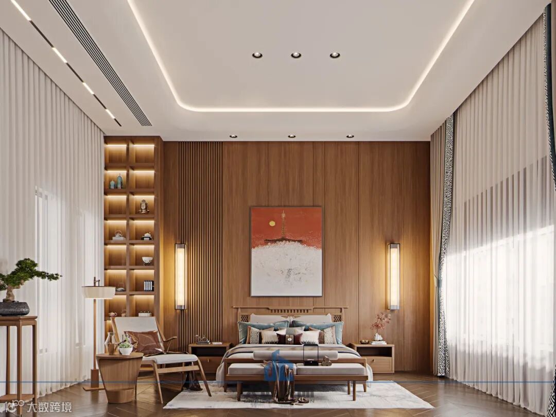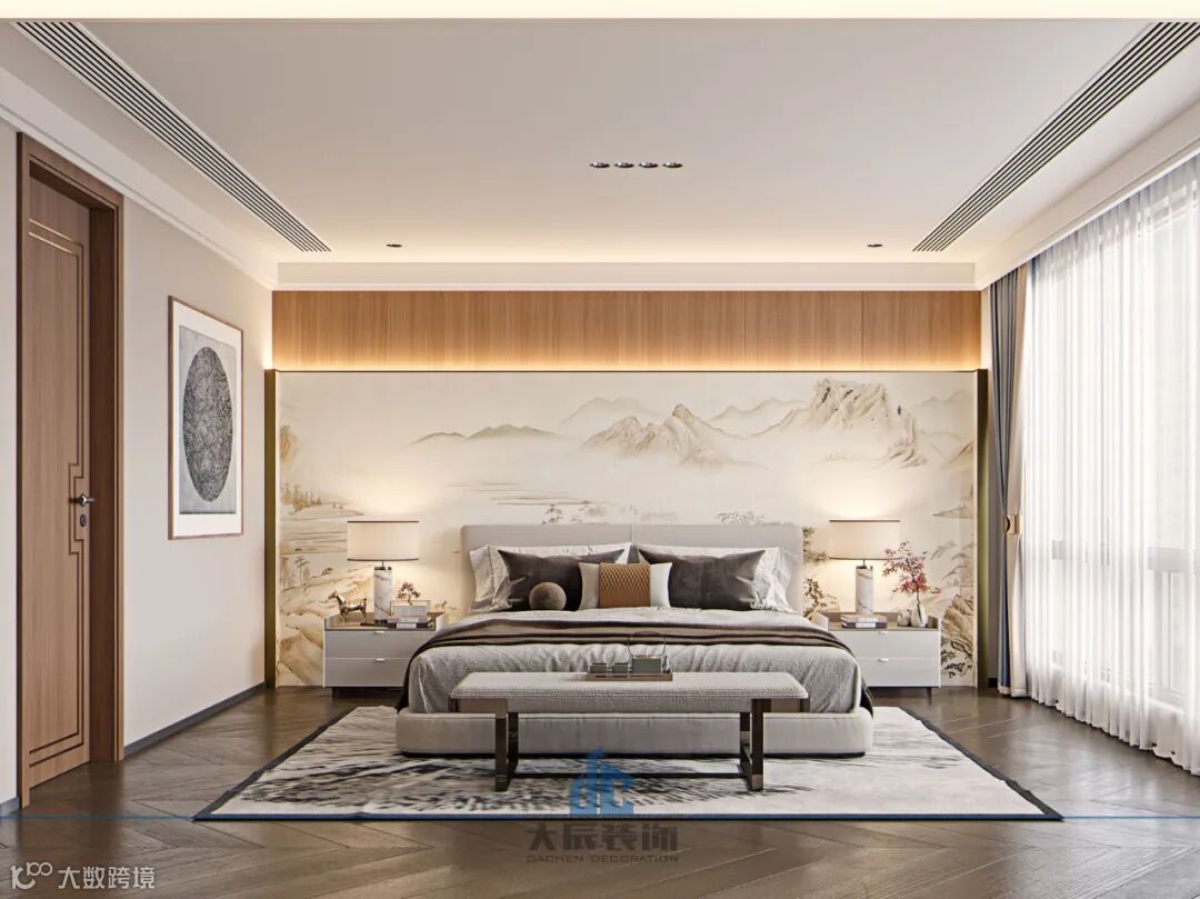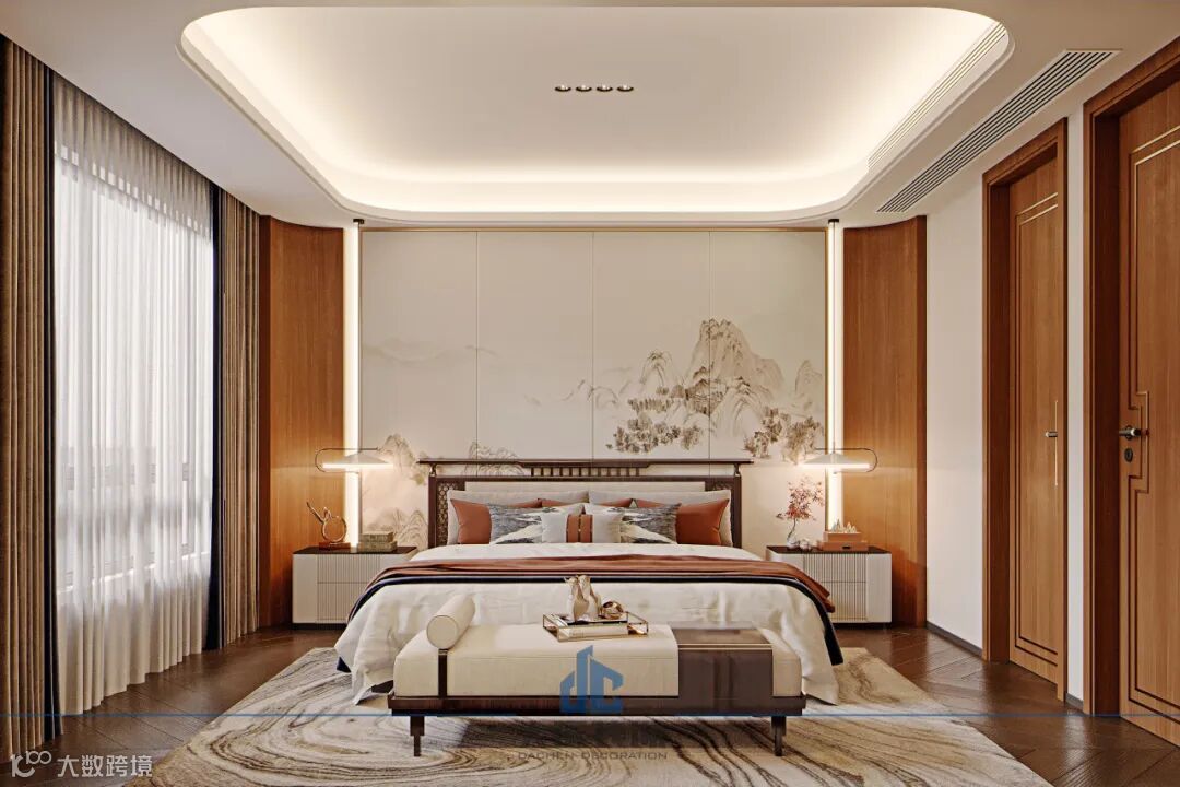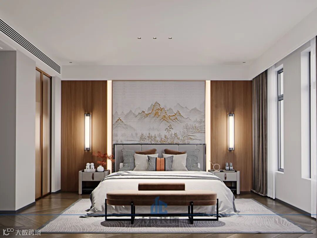 二楼的三个卧室设计风格一致,充满了国风的气息,每个房间最为引人注目的便是那面国风高山背景墙。家具的款式和颜色都与国风背景墙和暖色灯线相协调,形成了和谐统一的视觉效果,营造出了一种独特而富有韵味的空间氛围。