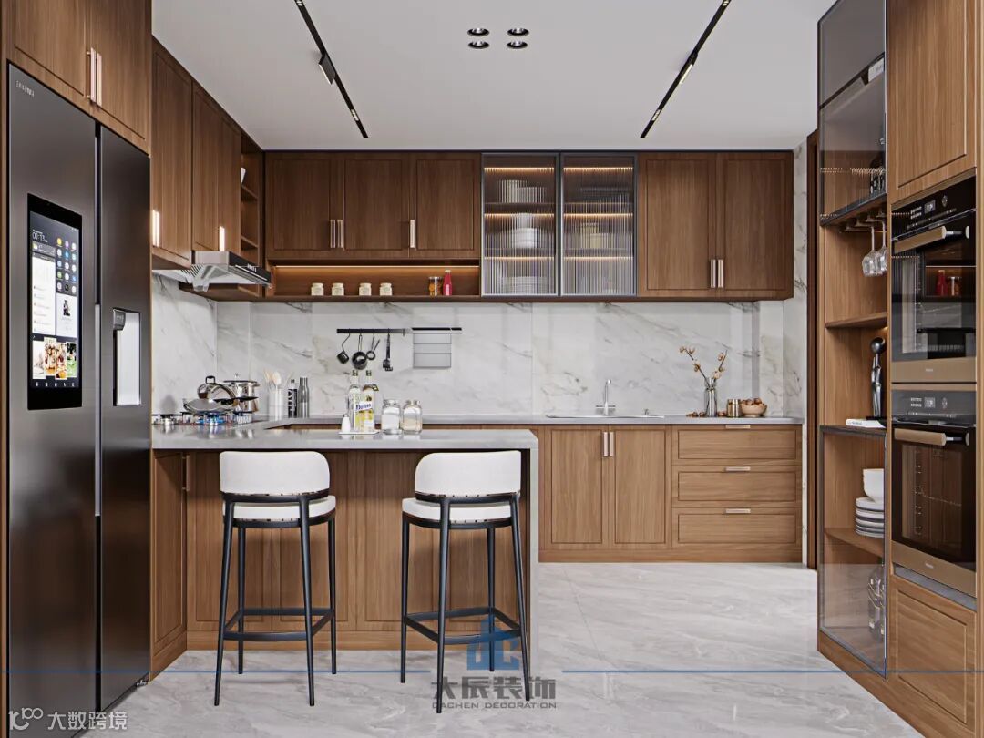 金属玻璃推拉门作为厨房和餐厅隔断,整个设计更加具有趣味性。厨房的设计比较注重实用性,深棕色和白色的主色调相互映衬,为整个空间营造了一种既稳重又不失清爽的氛围。木质橱柜的选用,不仅增添了自然与温馨的气息,还体现了设计师对传统材质的理解与运用。