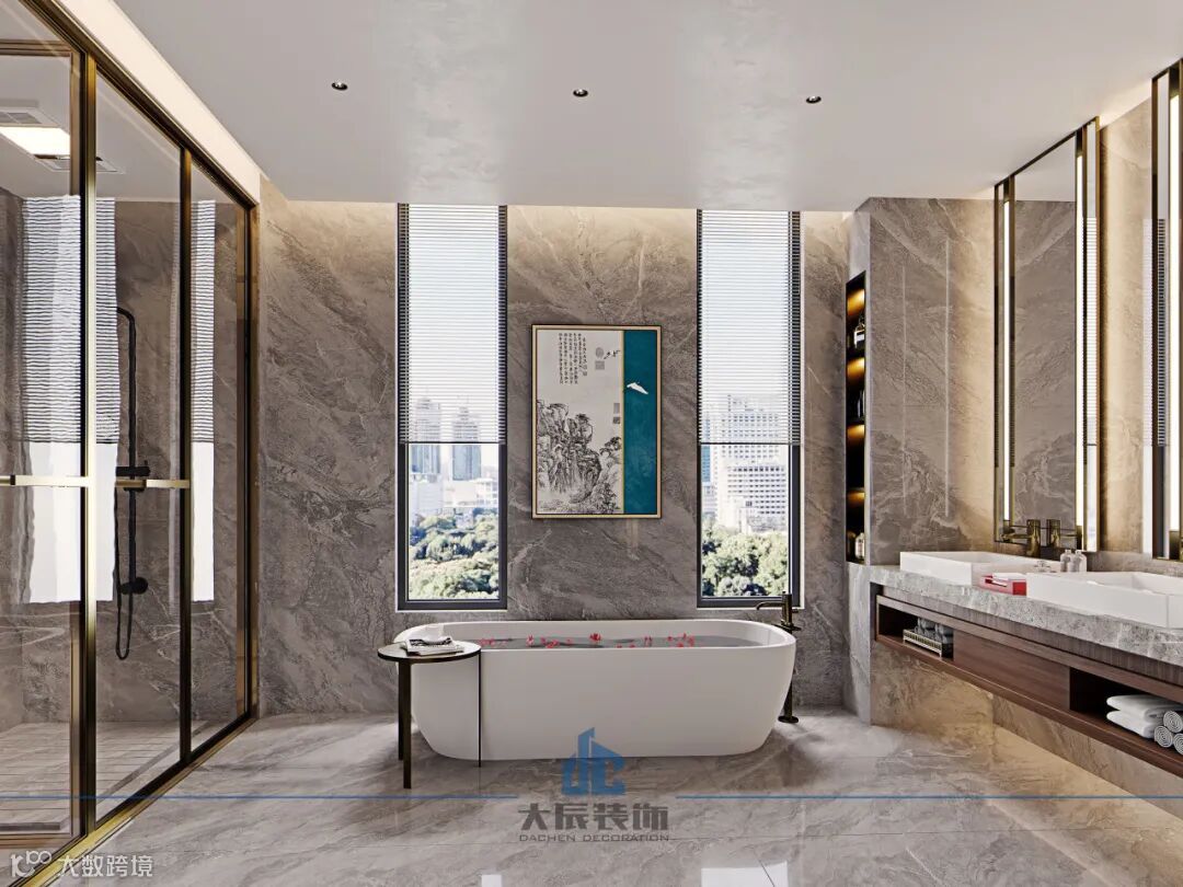 主卫的设计比较大胆前卫,灰色大理石的运用与金属框的点缀,巧妙地将现代感与奢华气质相融合,营造出一种既宽阔又明亮的视觉效果。