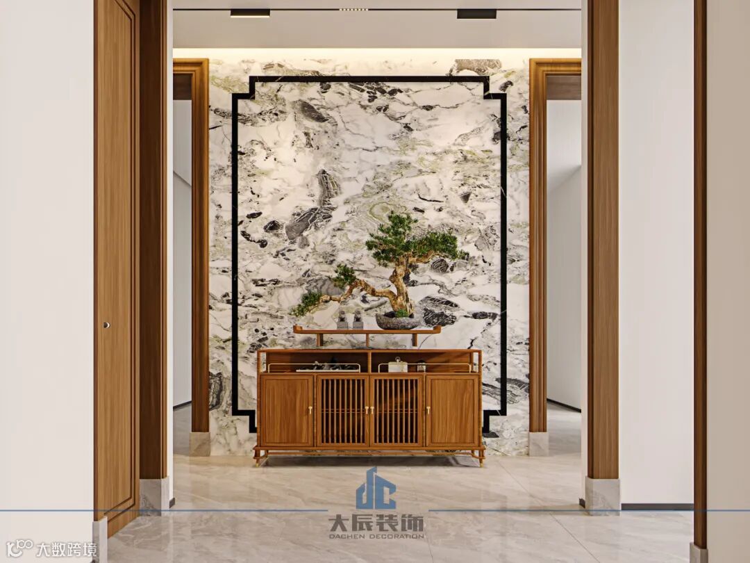 中式盆栽、棕色木质柜、黑色大理石线条装饰、鎏金纹大理石背景墙,这些元素都带有浓厚的中国传统文化和审美特色,设计师将它们巧妙地融合在一起,营造出一种既传统又现代、典雅又奢华的空间氛围。