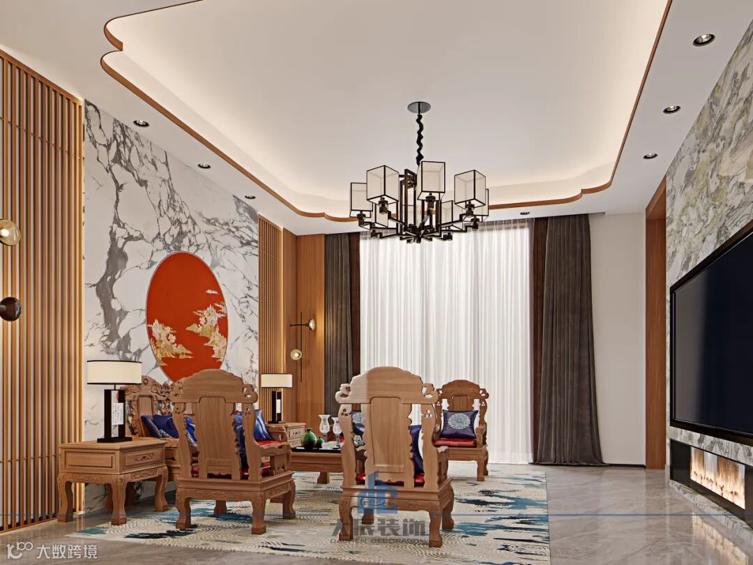 当中式灯具与东方意境的古韵美与现代设计风格相遇时,整个客厅仿佛被赋予了新的生命与灵魂。这种融合不仅展现了传统与现代的和谐共生,更营造出一种独特而迷人的空间氛围。