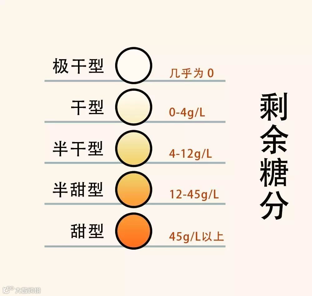 剩余糖分(ResidualSugar/RS)与葡萄酒的甜度相关,指经过发酵后并未完全转化成酒精的多糖。尽管说人们对甜度的感知能力因人而异,但根据剩余糖分的高低,静态型葡萄酒可分为以下5类: