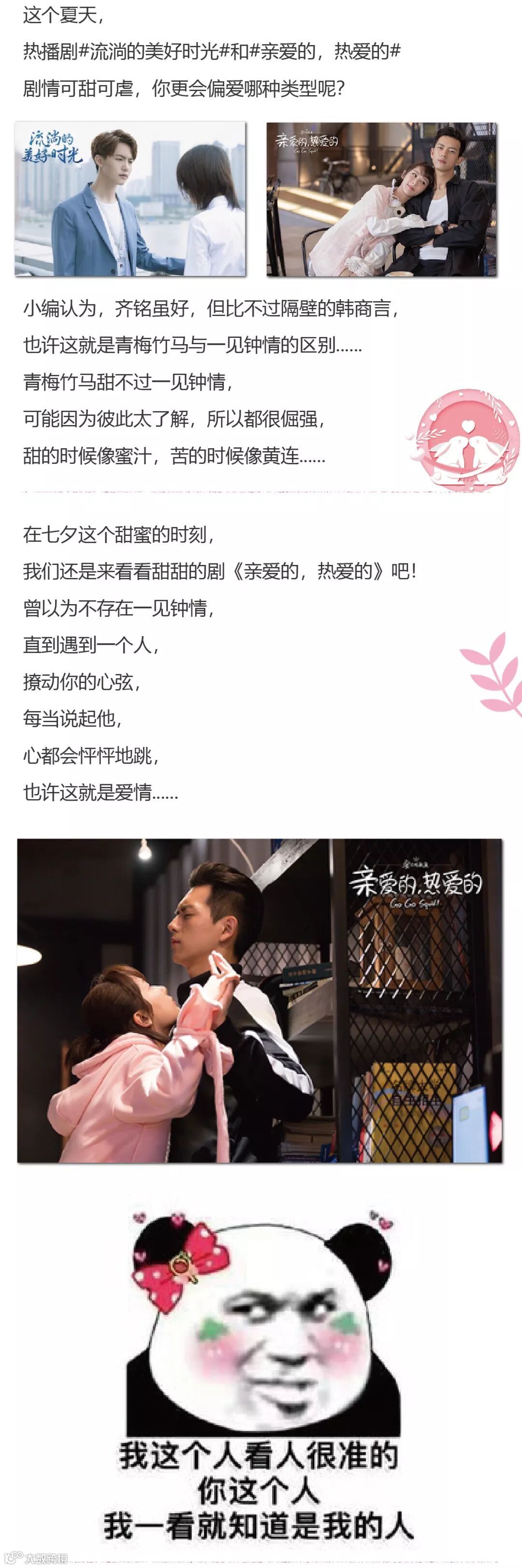 导读:在七夕这个甜蜜的时刻,我们还是来看看甜甜的剧《亲爱的,热爱的》吧!曾以为不存在一见钟情,直到遇到一个人,撩动你的心弦,每当说起他,心都会怦怦地跳,也许这就是爱情......