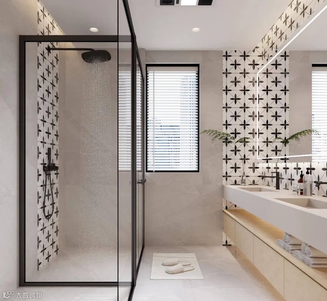 超长岩板台盆满足双人同时洗漱,大面积黑白花砖墙面成为视觉焦点,大尺寸百叶窗让自然光满溢整个空间。晨起的匆忙在此刻变得从容,是改善型家庭的理想选择。