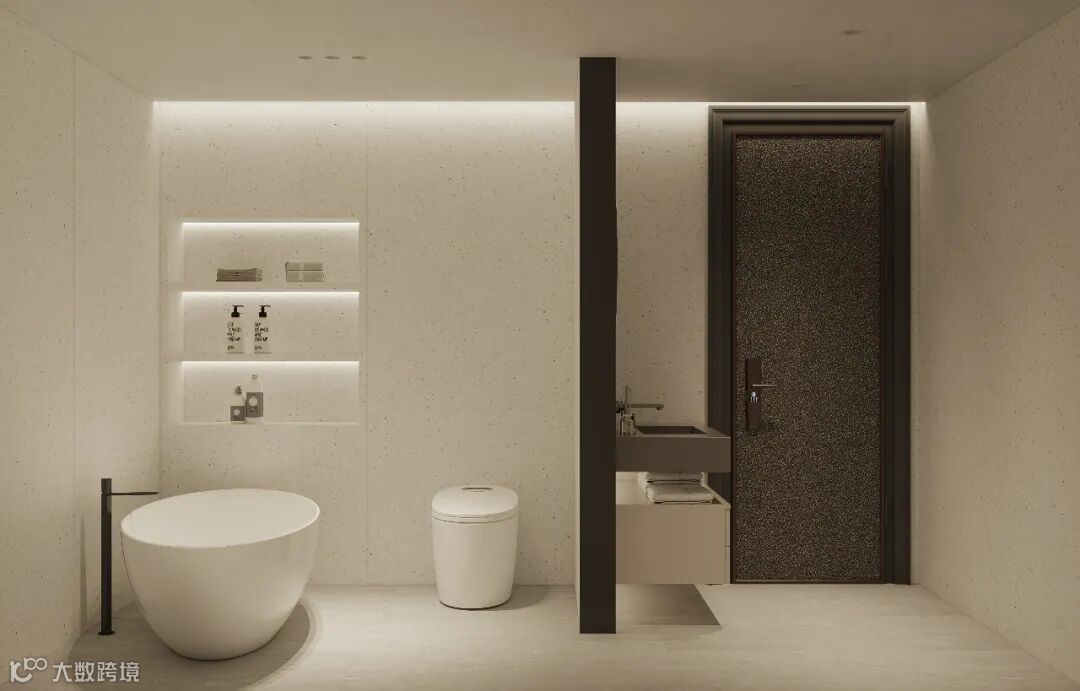 无主灯设计 + 悬浮发光收纳柜,在柔和暖光里消解了一天的疲惫。独立浴缸与智能马桶分区布局,黑色立柱巧妙划分空间却不遮挡视线,是追求松弛感的私宅首选。