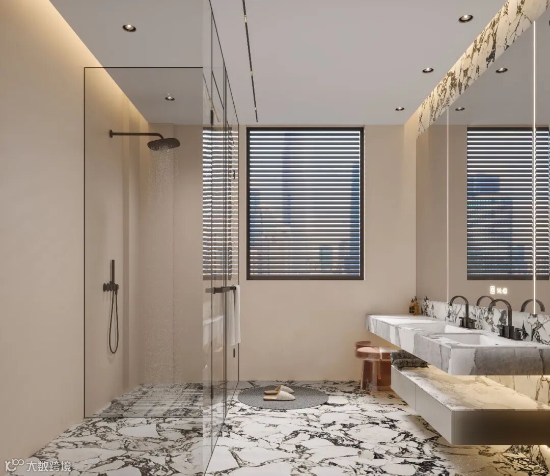 潘多拉奢石台面搭配大花白大理石地面,暖杏色墙面柔化了石材的冷硬,线性灯 + 大镜面延伸了空间纵深感。在精致与温馨的平衡里,打造出堪比星级酒店的卫浴体验。