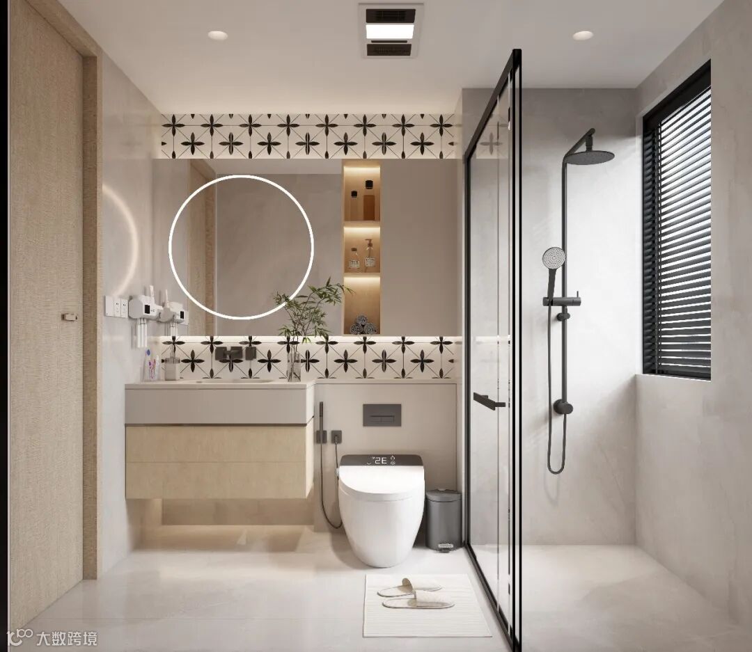 浅灰基底搭配黑白复古花砖,原木色柜身中和了冷调,带灯圆镜既是美妆镜也是氛围灯。智能马桶 + 玻璃隔断干湿分离,把实用和颜值平衡得恰到好处,适合追求温馨质感的都市家庭。