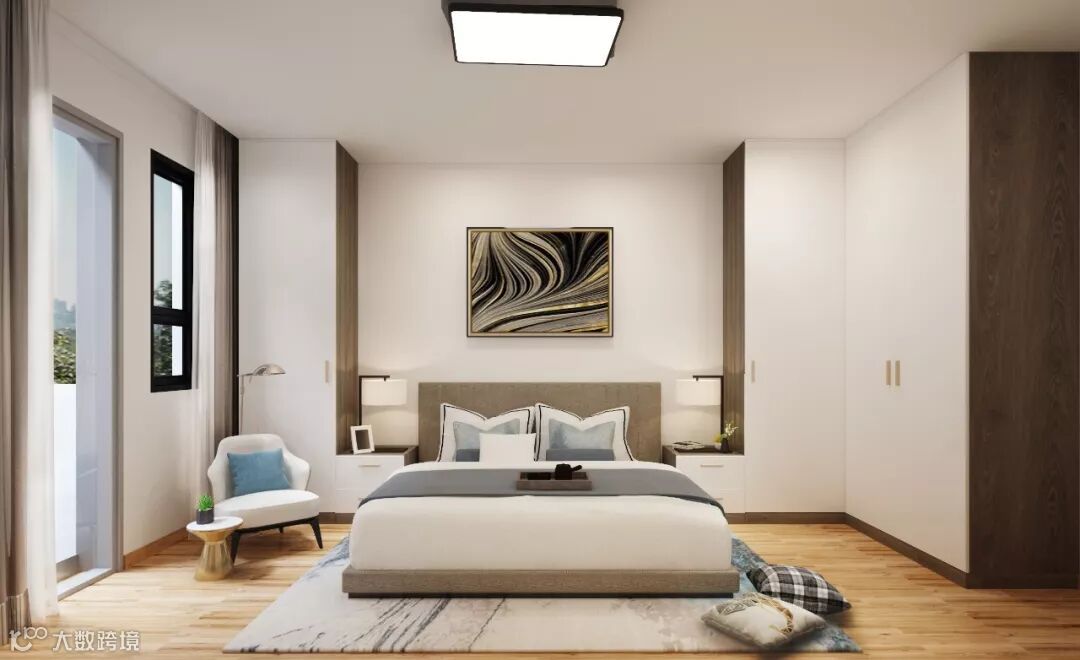 木质主卧柜子为这间极简主义的主卧营造出简洁明快的氛围,也提供了充足的储存空间。