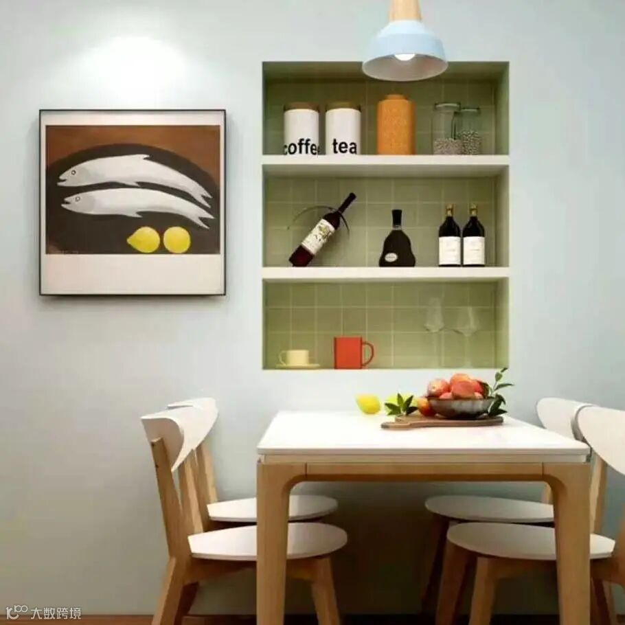 餐厅的壁龛可以充当餐边柜的功能,放上平时常用的碗碟和酒等,不仅十分美观,也可以使空间更加整体简洁。
