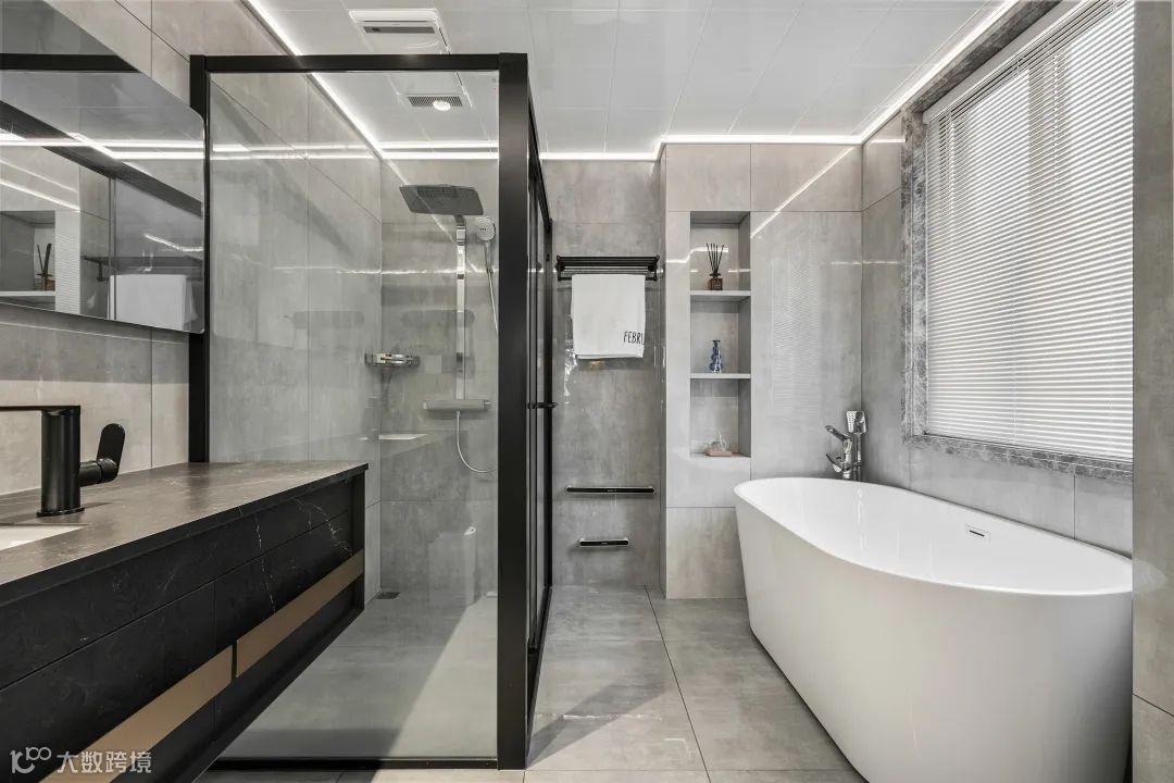 如果采用的是壁挂马桶或者嵌入式花洒的话,壁挂马桶需要砌假墙,可以在半高的假墙上做壁龛。形成一个简单的置物台,可以在上面安装隐藏灯带。而入墙式花洒是管道嵌入墙体,那么可以考虑再挖10cm壁龛放沐浴用品。