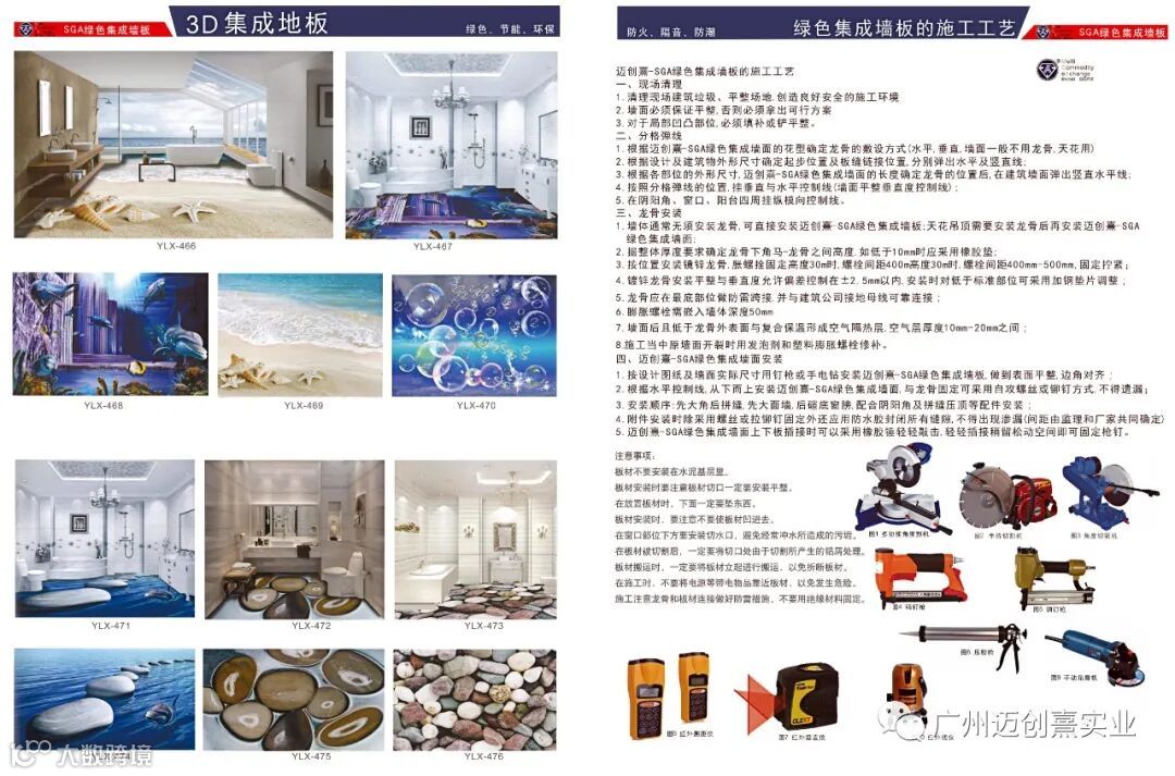 1.按设计图纸及墙面实际尺寸用钉枪或手电钻安装迈创熹实业-SGA绿色集成墙板做到表面平整,边角对齐;