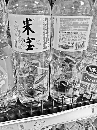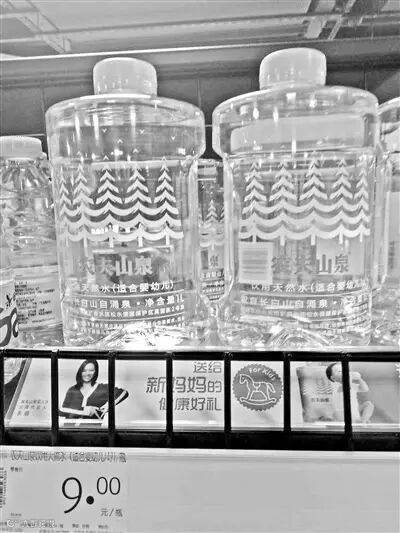 北青报记者走访多家超市发现,货架上都摆有不少售价不菲的瓶装水。比如农夫山泉的一款标注“适合婴幼儿”的饮用天然水被摆放在醒目位置。该款水容量为1L,售价竟为9元,价格算下来堪比某些品牌的食用油;青岛可蓝矿泉水公司还推出专门蒸煮米饭用水“米宝”,1.5L售价4.9元,以及适用于婴幼儿的“333米崂山花岗岩深层泉水”,1.5L售价5.9元,而同样是1.5L的怡宝饮用纯净水,售价只要2.8元。