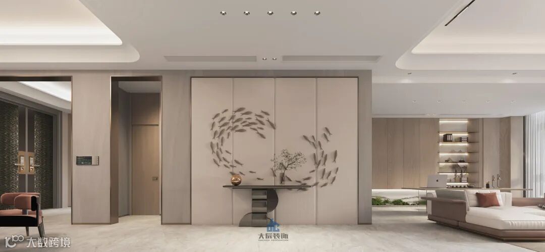 鱼形图案是本案设计的亮点之一,与整个空间的简约风格形成了一种对比,增添了空间的趣味性和层次感。鱼作为水的象征,寓意着流动、变化和生机,与现代生活的快节奏和变化多端相呼应。