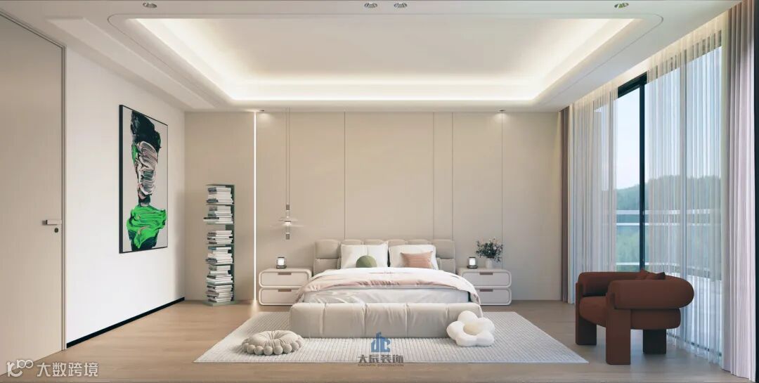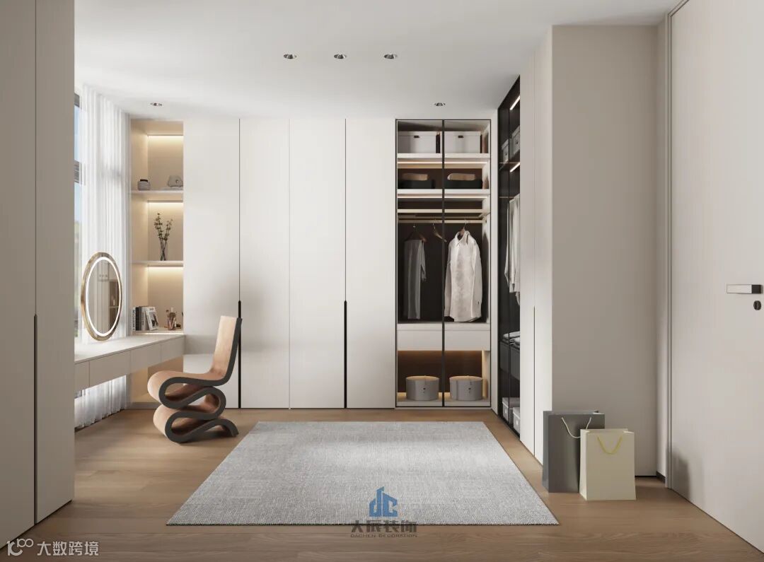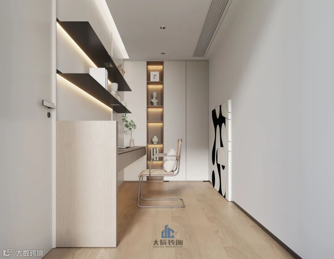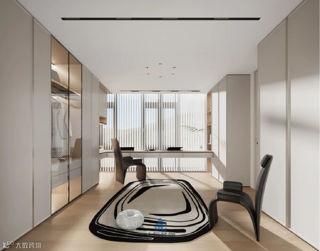 主卧设计采用了套房式布局,巧妙融合了睡眠区、书房、衣帽间以及卫浴功能区域。内部装饰简约而不失时尚感,以温柔的米白色为主导,打造出一个既充满温馨氛围又极具舒适度的私人休息环境。
