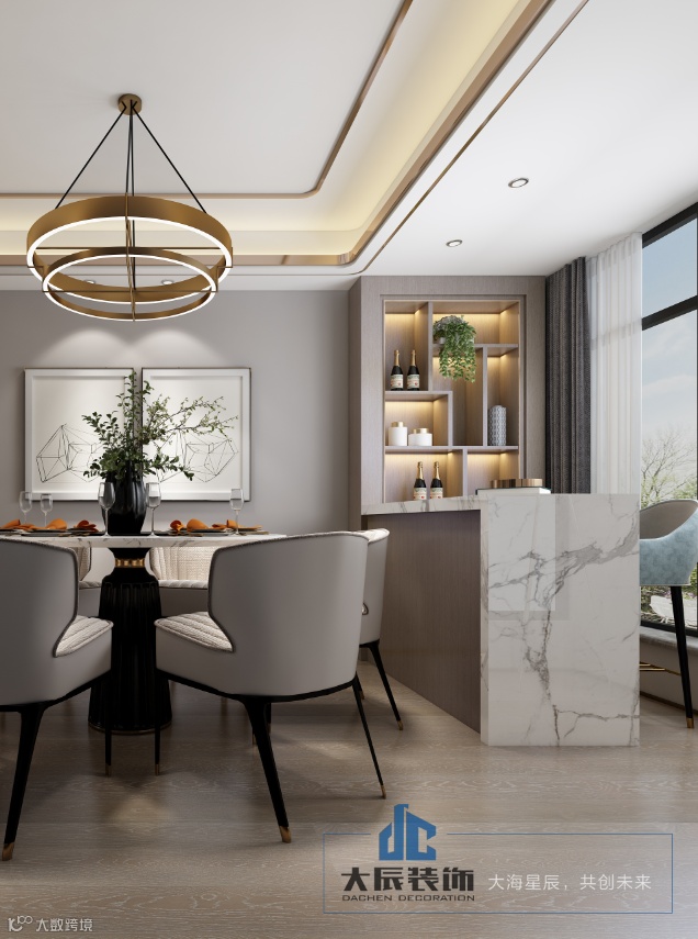 关注空间的灵活性和延伸感,餐厅与客厅采取一体化的设计,通透宽敞,增加了整体空间的层次感,旁边设计一个吧台,在用餐之余,还可以吃早点,品尝杯中美酒。