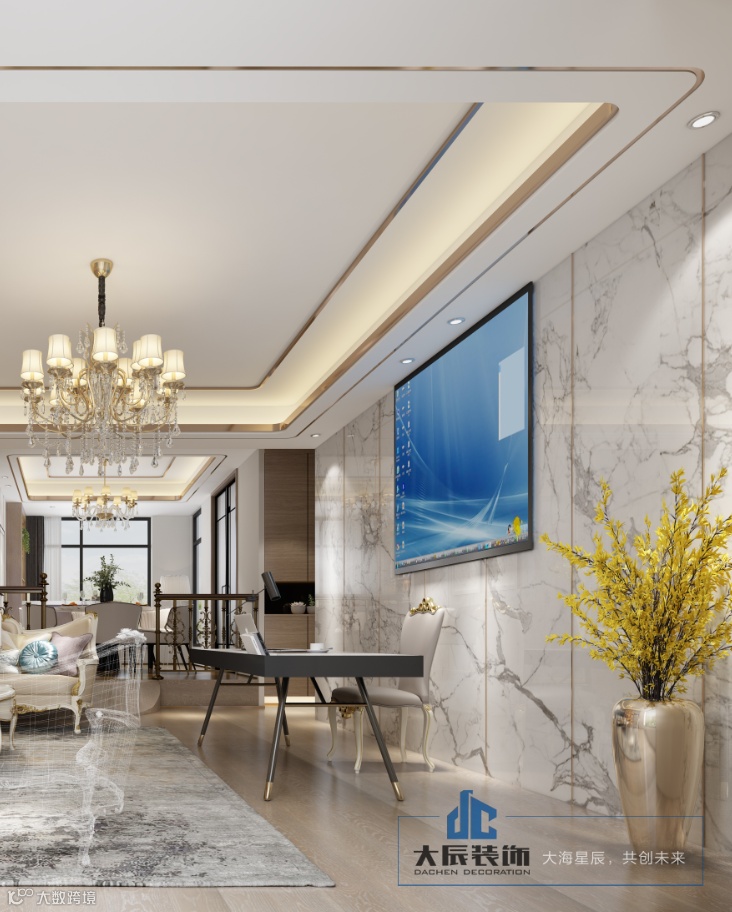 客厅线条优雅的水晶灯,以轻盈的姿态预告了夜晚的浪漫情调。电视背景大理石墙砖,更显得有质感,而沙发背景采用格子框造型,摆放一些工艺品和书本,再搭配一款带有简欧风格的沙发,轻奢风格扑面而来。