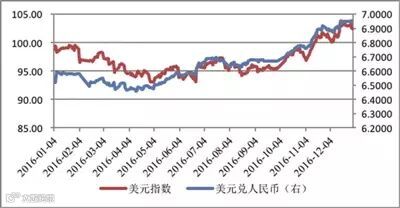 2016年在美国加息预期下,美元大幅升值。美国经济基本面超预期好转,2016年12月美联储加息靴子落地,2017年加息概率大大上升等因素都为美元指数进一步走高提供了基础。