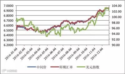 2016年人民币对美元中间价、即期汇率与美元指数走势 |