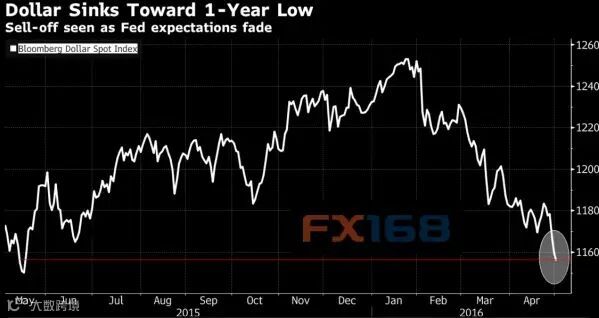 因美联储主席耶伦暗示,由于全球风险和国内通胀低于2%目标,将采取“谨慎”加息态度,美元自3月中以来一路下行。
