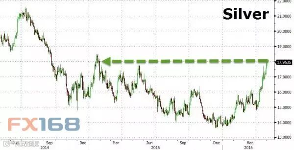 现货银周一一度触及去年1月来最高的18.01美元/盎司。