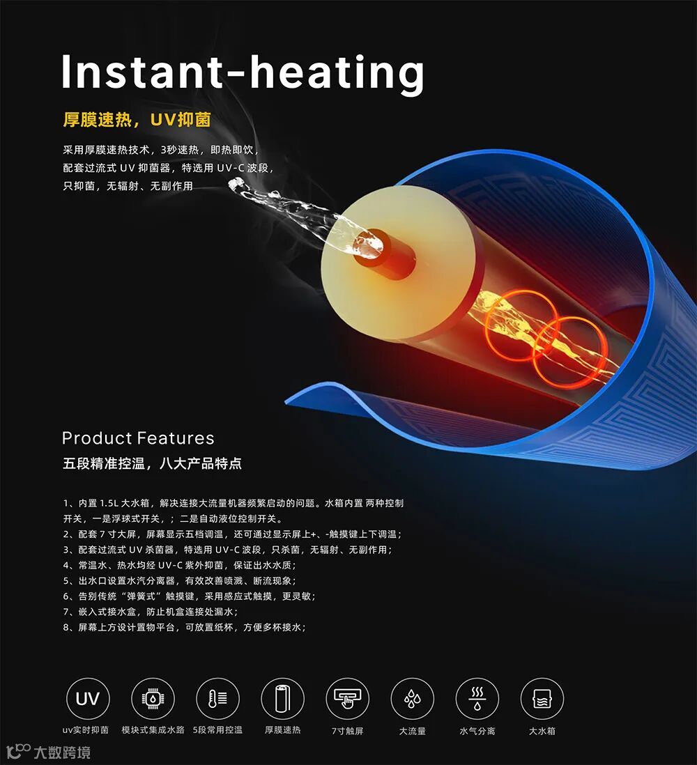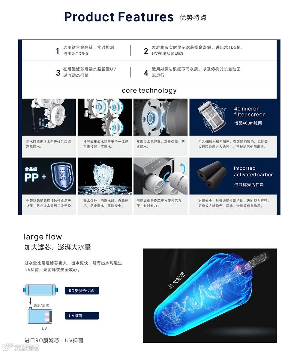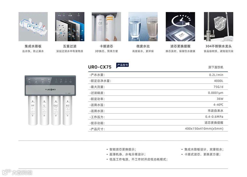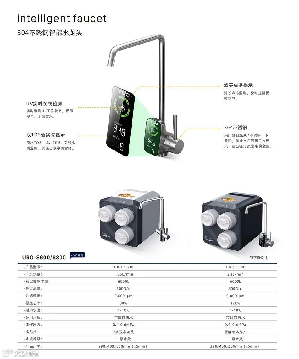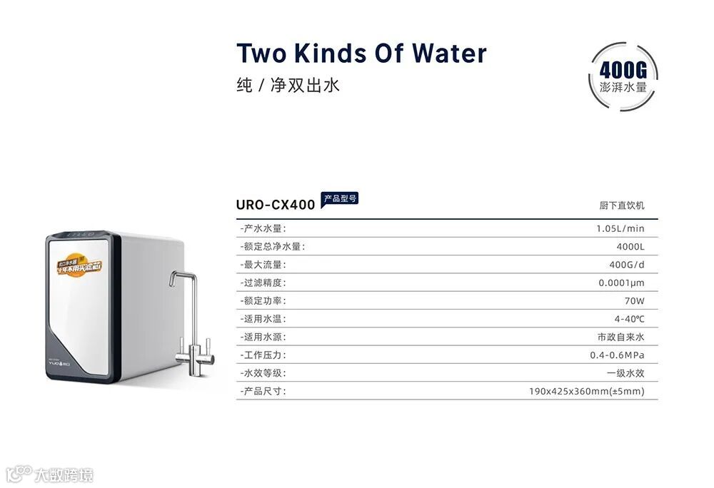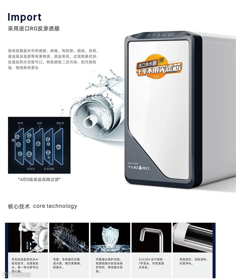 优口,掌握全系列净水核心技术,如中央分质净饮水系统技术、集成水路纯水回流技术、UV动态杀菌技术、RO反渗透净水技术、 UF超滤技术、多水路多循环净水系统技术、速热变频技术、智能变频技术、分质循环供水技术等多项专利技术等100+项国内和国际专利。