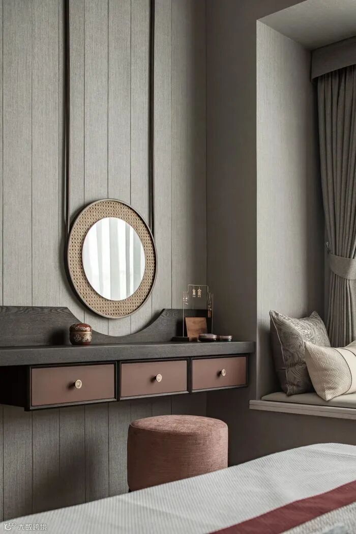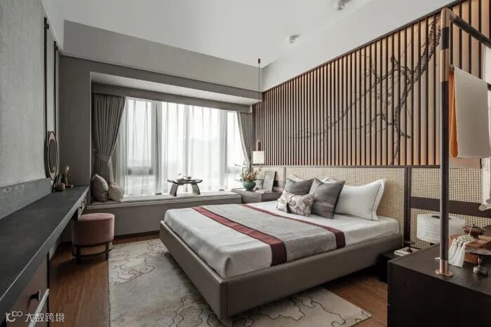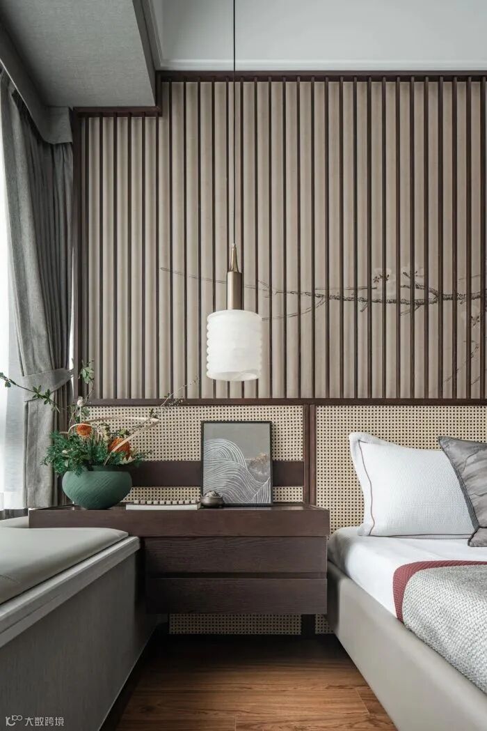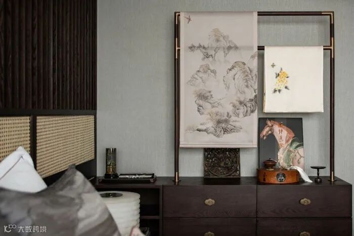 取中式传统衣架造物的洗练形式,将边几与床头柜整合表达;电视背景由挑台作为贯穿,兼具梳妆台和置物架的功能需求。