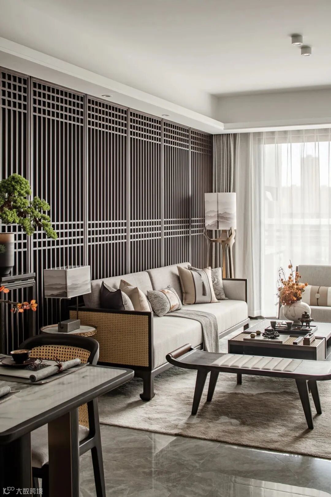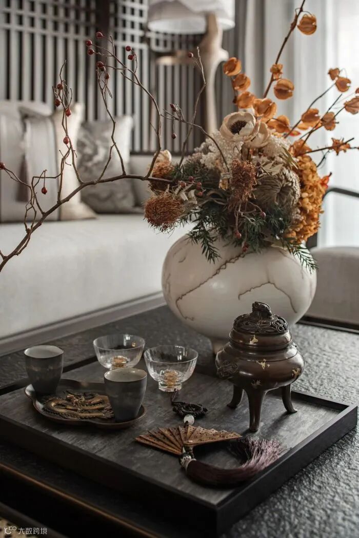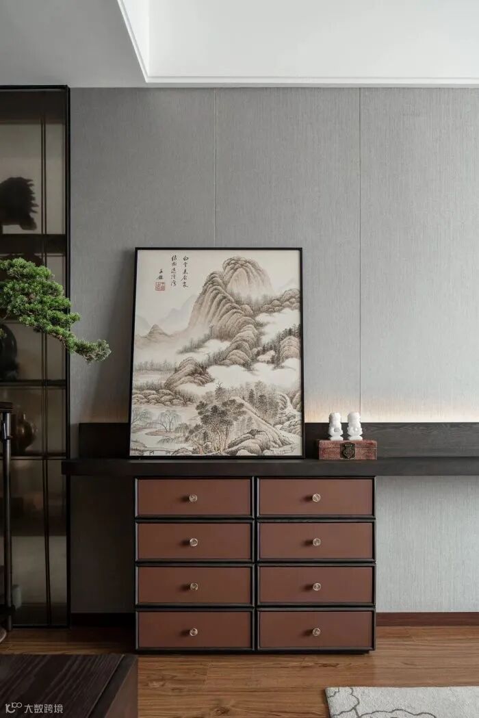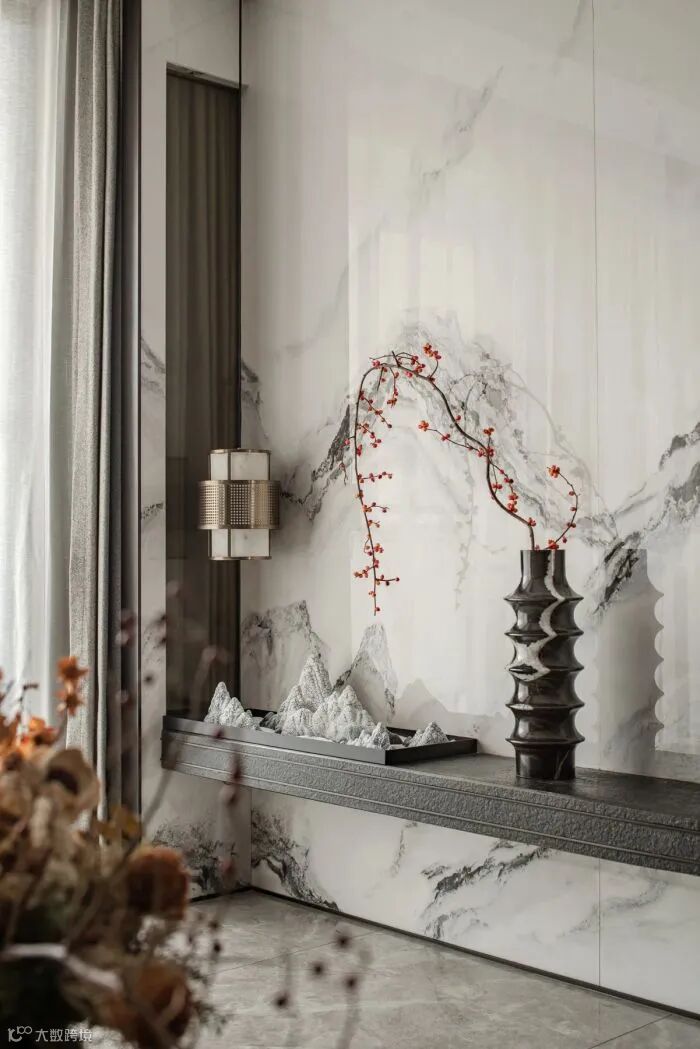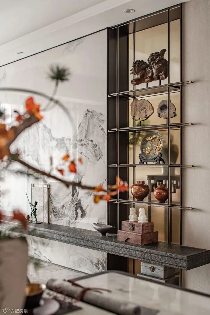 艺术的笔调包容自然和人文,克制地在一方空间内铺叙恬淡意境。主卧床头背景格栅虚掩,梅枝为底,虚实变幻间再现梅花轻盈飘落的画面,悠远潇潇。