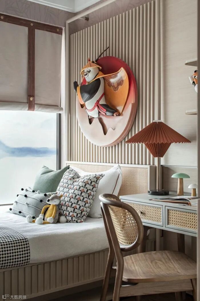 功夫熊猫的主题,通过3D打印技术营造浮雕般的半立体效果,表现为从墙面一跃而出的瞬间。木饰墙面契合卯榫结构的条栅,构建规律的线、面穿插效果;克制与张扬,外放和含蓄,微妙的尺度传递出童真的趣味。