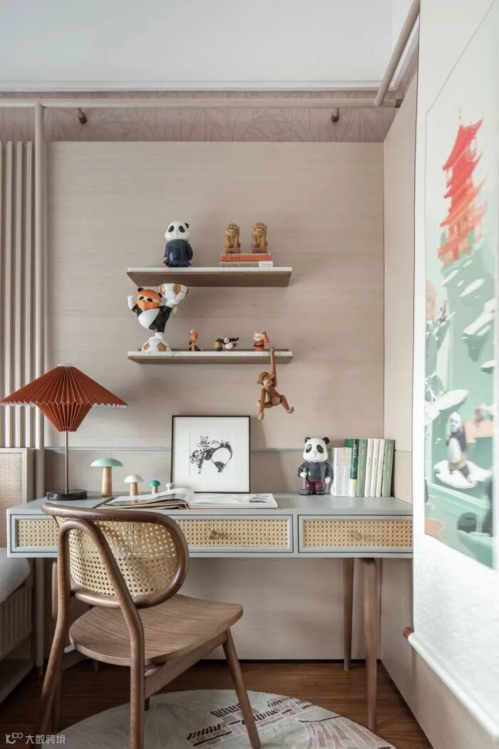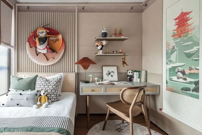 男孩房选择木质饰面,透过温润的木质肌理展现自然的生生不息;穿插的苔藓绿,灵感源自覆盖地表的生灵,暗喻生机旺盛。