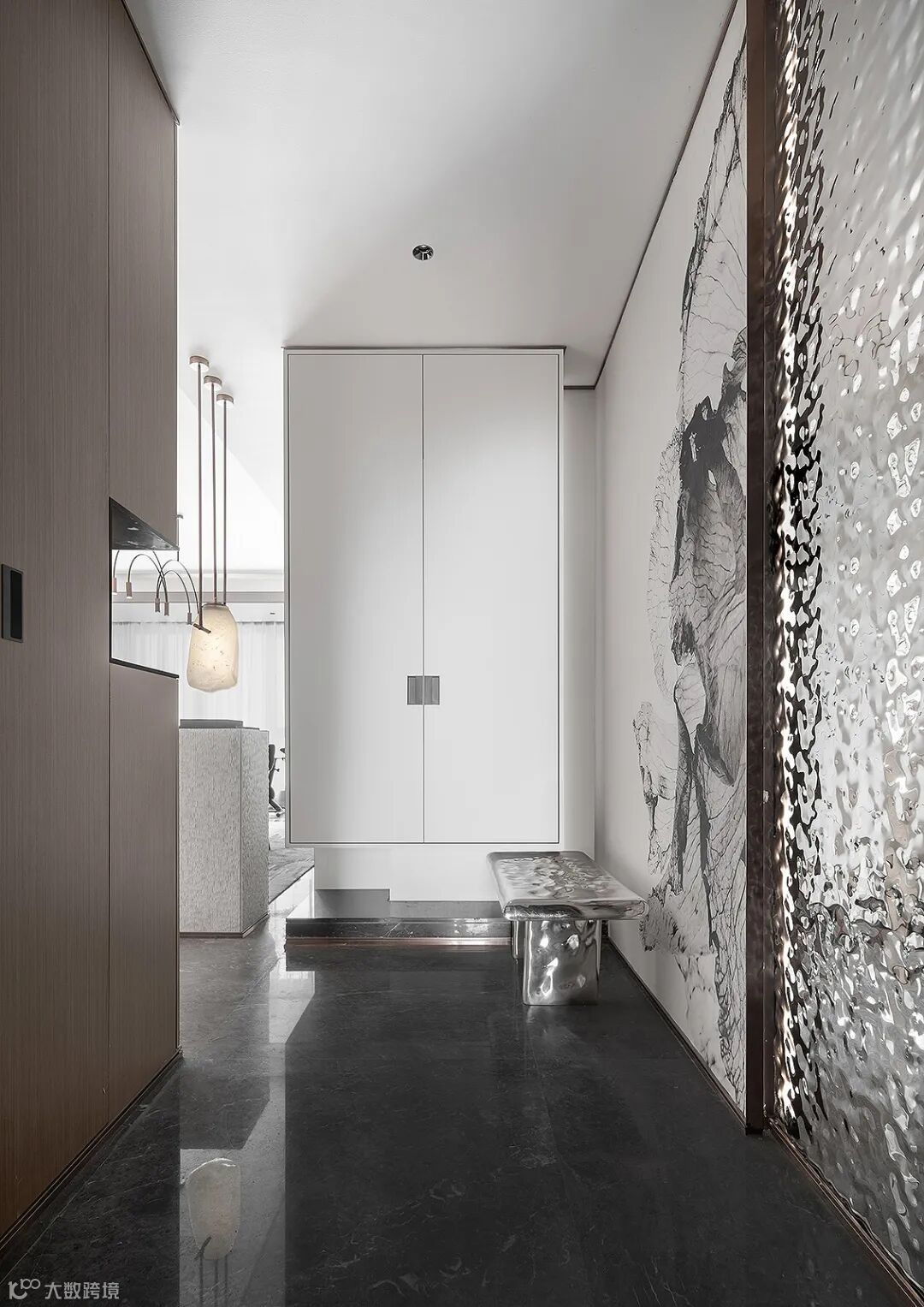 玄关不一定阔,但一定顺势而为、恰到好处,墙面绽放的泼墨画以水波纹的姿态衍生出文化意蕴,融入空间、引人遐想,我们倡导以居住者的身心感受丈量空间尺度的舒适。