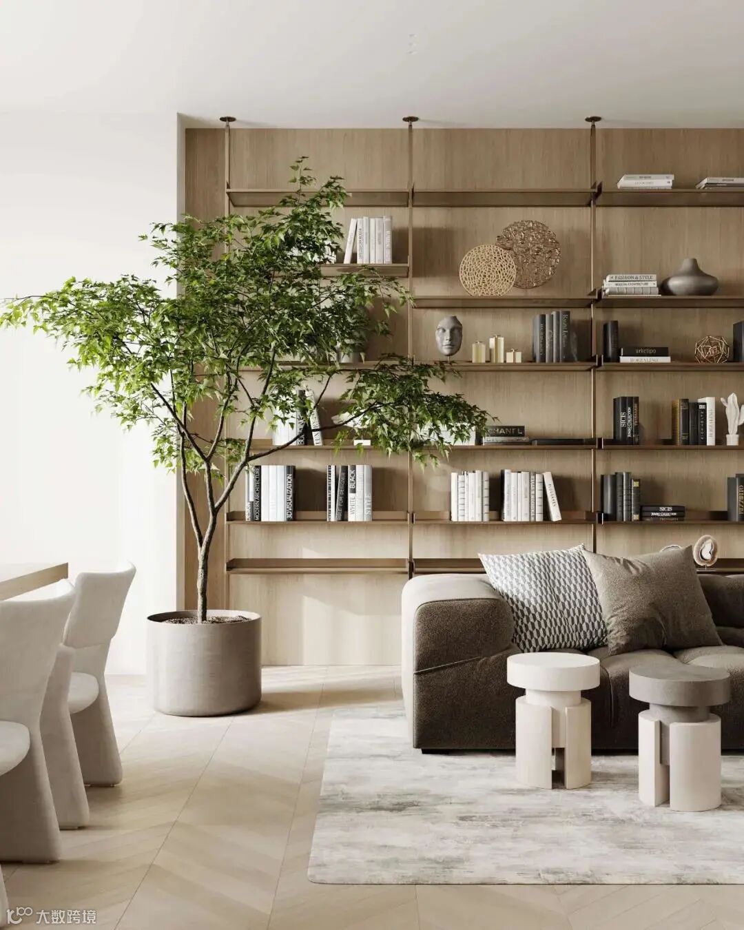 在客厅,书本和艺术品有序地陈列在书柜上,书柜旁有一抹绿意衬托着,整个画面干净而宁静。让人联想起鲁迅先生曾说的:“坐在椅子上翻一翻书就是休息了。”