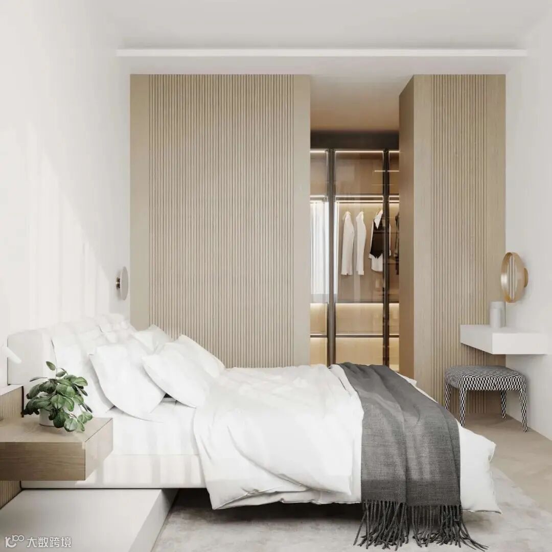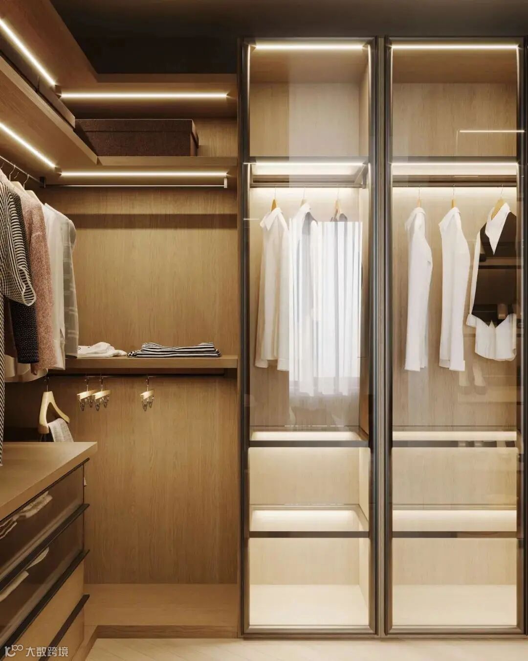 衣柜采用了半开放式和玻璃柜门结合的设计,方便用户使用的同时,又极具现代美学的气息。