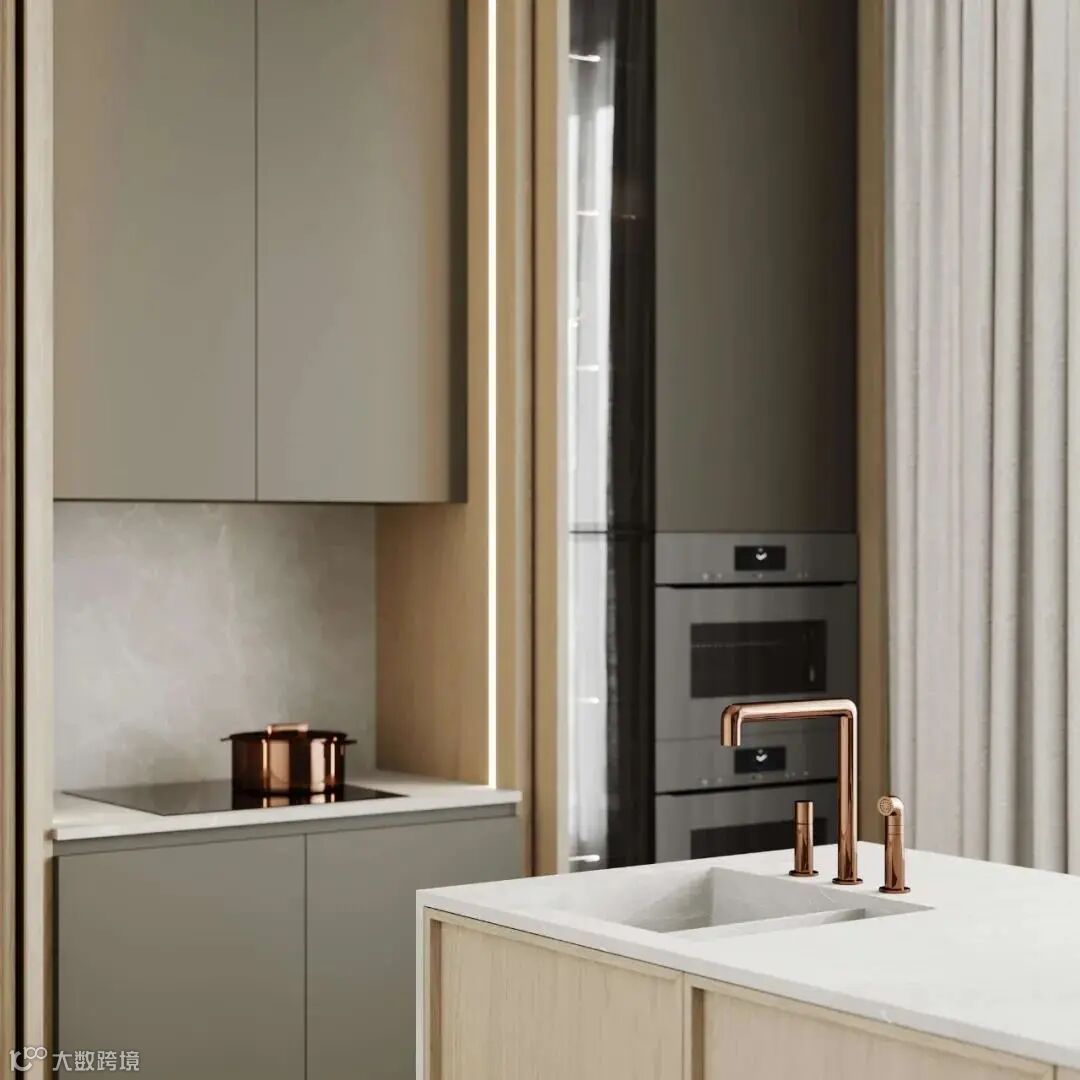 餐厅以米驼色和米色为主色调,搭配上开放式的设计,极大地拓展了视觉空间,方正而宽敞。洗手池上的水龙头使用了金属铜材质,与柜面上磨砂黑相互映衬。