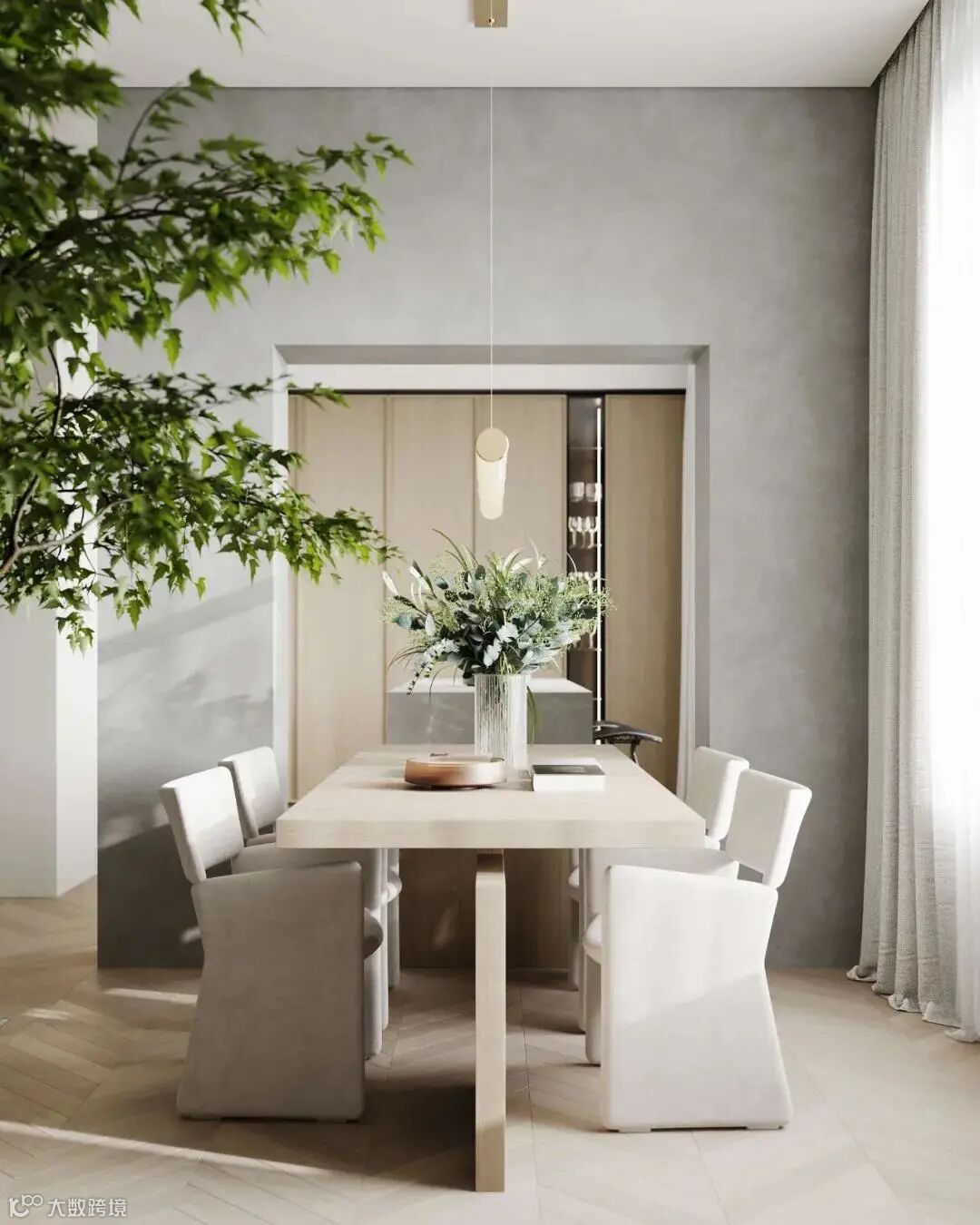 餐桌大理石材质的触感和绿植将自然的气息带入了室内,为亲朋好友聚餐时增添了几分舒适。