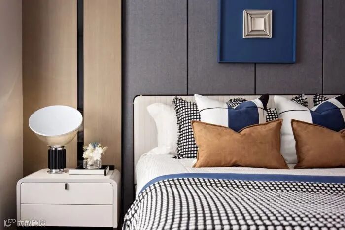 局部以艺术品装点出空间的气质,床头上的当代艺术画作以超越传统的绘画和雕塑传达出现代的空间气质。