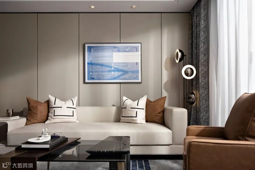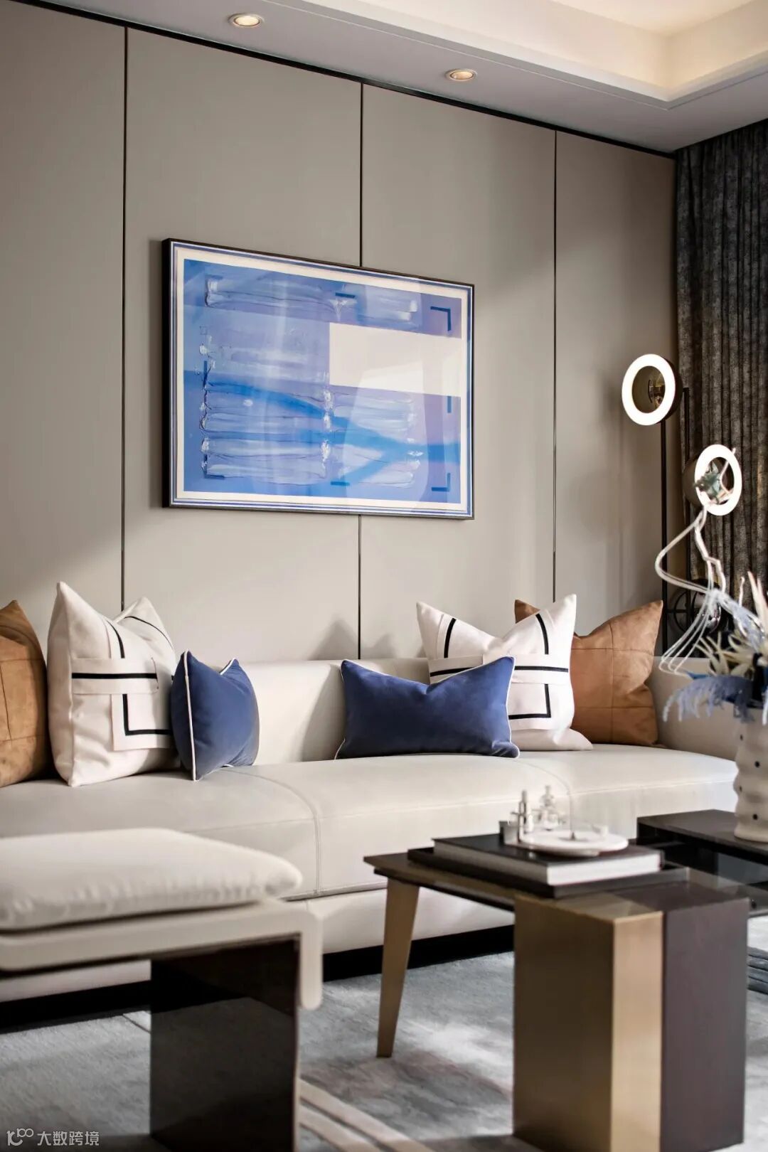 客厅以深木色和灰白色铺陈,同时用蓝色作为点缀,冷暖关系的对比不仅丰富了空间的色彩层次,也为空间注入些许宁静优雅的艺术氛围。