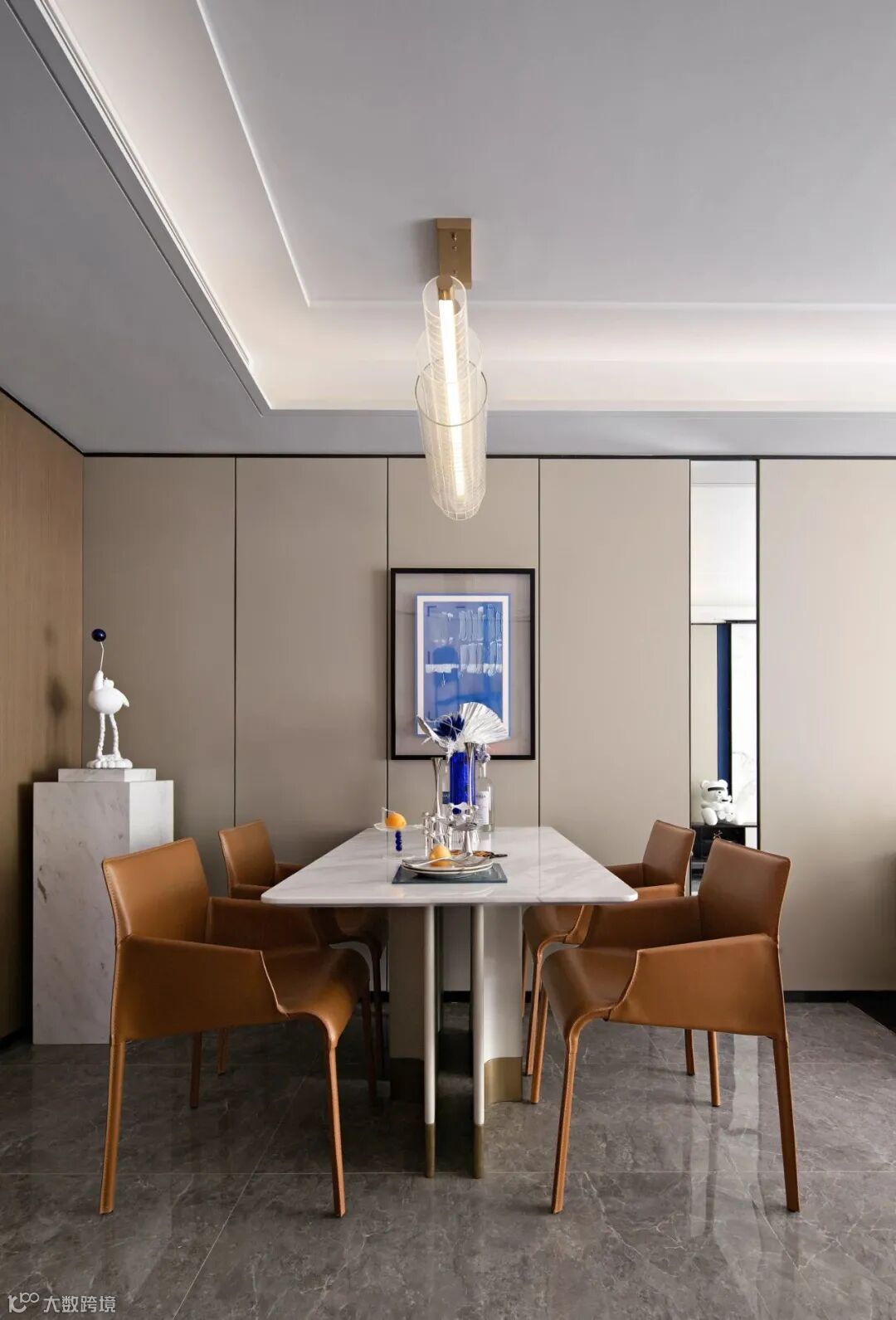 客餐厅一体的设计使整体空间更加纯粹安静,简单而有质感的材质在光影的照射下愈显通透自然,墙角造型独特、趣味十足的艺术装置为空间置入人文艺术气质,无形中彰显现代年轻人不拘一格的生活方式,营造出轻松愉悦的家庭氛围。