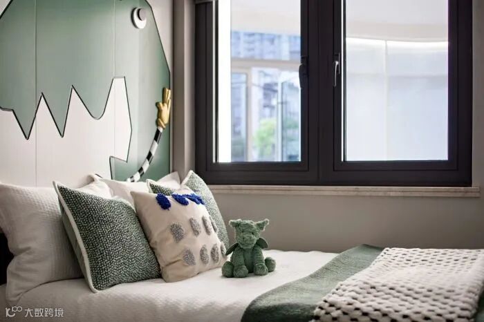 小朋友特别喜欢恐龙,所以设计营造了一个恐龙主题的房间。绿色与蓝色的搭配生动活泼,颇具童真效果的艺术装饰与鲜花挂画,仿佛使小主人居住在森林中一般。