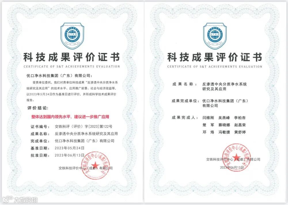 2023年6月,优口净水荣获”科学技术成果评价证书“,由交铁科技评价中心(成都)有限公司为评价机构,全国科技成果评价服务平台监制。