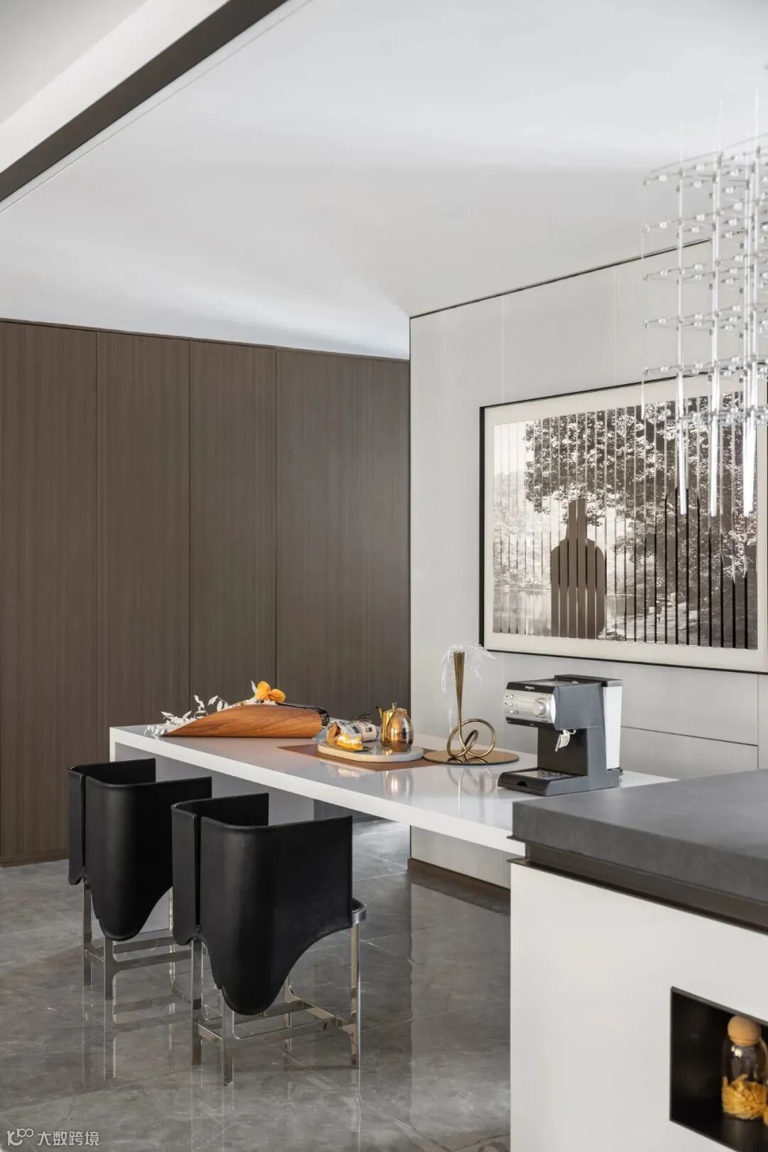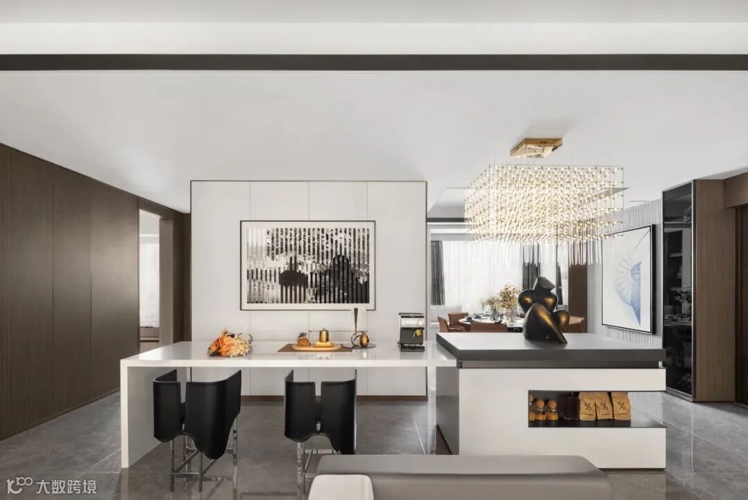 女主人的水吧台就设立在客厅的一旁,方便家庭聚会或私下惬意悠闲时家人之间独酌共饮,其乐融融,吧台一角的艺术摆件诙谐幽默为空间气氛增添一分时尚。